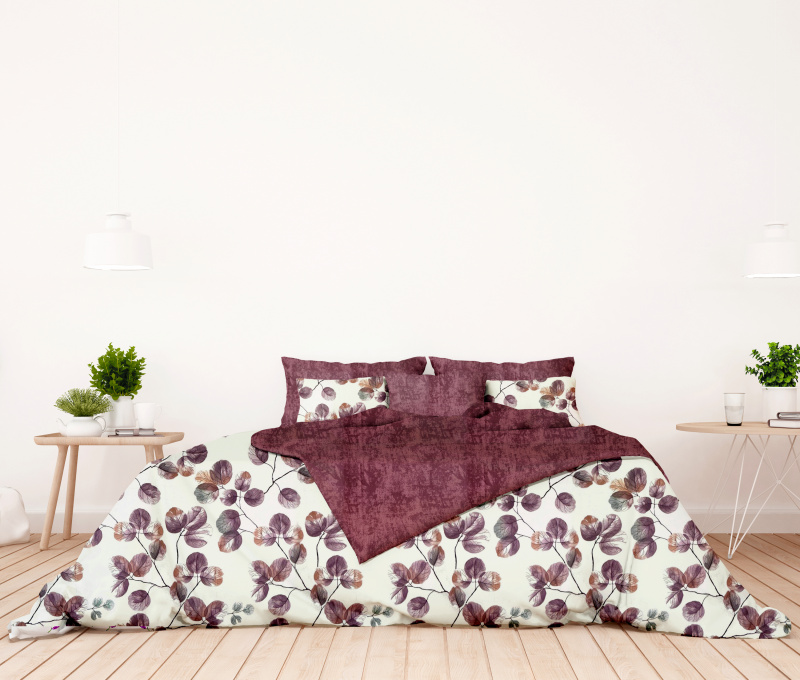 Bavlněné oboustranné povlečení s jemným akvarelovým vzorem listů na bílém a bordo-šedém podkladu. Toto povlečení spojuje přírodní motivy s elegantní barevnou kombinací, která dodá vaší ložnici sofistikovaný a moderní vzhled.