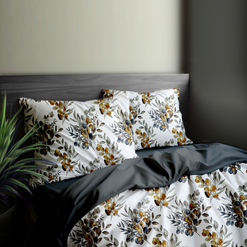 Elegantní bavlněné povlečení s podzimním motivem eukalyptových větviček v tmavě šedém odstínu přináší do ložnice sofistikovanou atmosféru inspirovanou přírodou. Jemný botanický vzor s listy eukalyptu dodává textilu jedinečný charakter, zatímco druhá strana v jednobarevném tmavě šedém tónu působí minimalisticky a moderně.