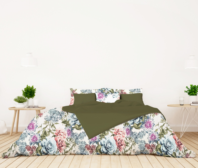 Bavlněné povlečení oboustranné - Květinová zahrada 2/olivové je vyrobeno z vysoce kvalitní bavlny, která zajišťuje pohodlí a dlouhou životnost. Jedna strana povlečení je zdobena půvabným květinovým vzorem s různými druhy květin v pastelových barvách, jako jsou růže či hortenzie, na bílém pozadí. Druhá strana je jednobarevná v olivově zeleném odstínu, což umožňuje snadnou změnu vzhledu vaší ložnice dle nálady. Součástí sady je povlak na přikrývku a polštář, dokonale sladěné v designu. Ideální volba pro ty, kdo hledají kombinaci elegance, svěžesti a praktičnosti pro svůj interiér.