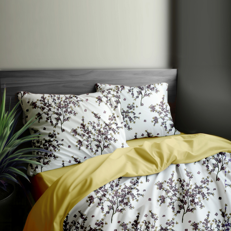 z jedné strány kvetoucí strom z druhé jednobarevná látka v žluté barvě.