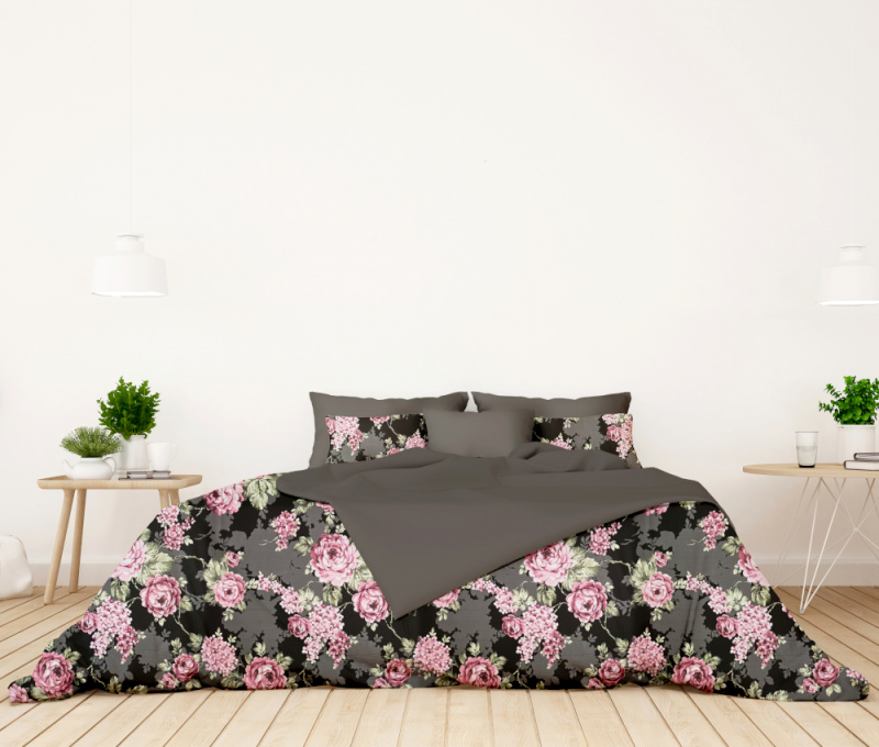 Ervi bavlněné povlečení oboustranné - Květy na černém/šedé