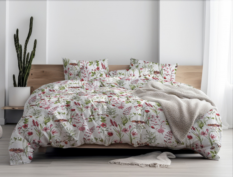 Toto povlečení je vyrobeno z kvalitní bavlny a je zdobeno krásným vzorem letní louky. Na povlečení jsou vyobrazeny různé květiny a rostliny v červených, růžových a zelených odstínech, které vytvářejí svěží a příjemný vzhled. Povlečení je ideální pro ty, kteří chtějí do své ložnice přinést kousek přírody a letní atmosféry.