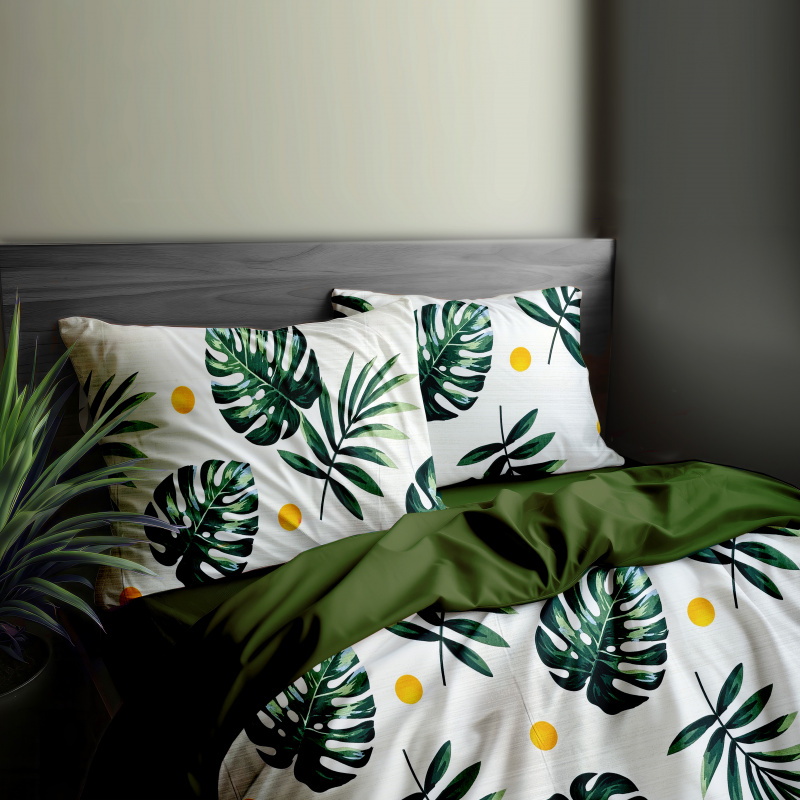 "Bavlněné povlečení oboustranné - listy monstery/olivové. Toto povlečení je vyrobeno z kvalitní bavlny a je oboustranné. Jedna strana je zdobena vzorem listů monstery a žlutými kruhy na bílém podkladu, zatímco druhá strana je jednobarevná v olivově zeleném odstínu. Povlečení je ideální pro milovníky přírodních motivů a přináší do ložnice svěžest a styl."