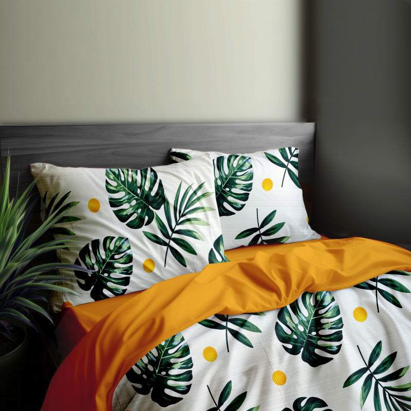 "Bavlněné povlečení oboustranné - listy monstery/oranžové. Toto povlečení je vyrobeno z kvalitní bavlny a je oboustranné. Jedna strana je zdobena vzorem zelených listů rostliny Monstera na bílém podkladu, zatímco druhá strana je jednobarevná oranžová. Povlečení zahrnuje polštář a přikrývku, které dodají vaší ložnici svěží a moderní vzhled."