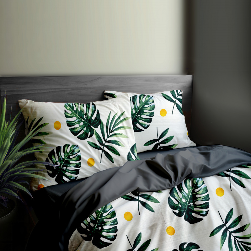 "Bavlněné oboustranné povlečení s motivem listů monstery a tmavě šedou barvou. Povlečení je vyrobeno z kvalitní bavlny a z jedné strany je zdobeno vzorem zelených listů monstery a žlutých kruhů na bílém podkladu, zatímco druhá strana je jednobarevná tmavě šedá. Moderní a stylový design tohoto povlečení je ideální pro oživení každé ložnice a přidání přírodního nádechu do vašeho domova."