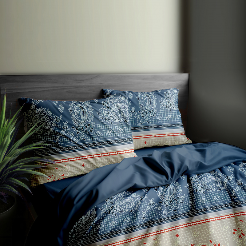 Dopřejte své ložnici nádech elegance a uměleckého kouzla s tímto krásným bavlněným oboustranným povlečením. Vyrobeno z vysoce kvalitní bavlny, toto povlečení nabízí oboustranný design. Jedna strana je zdobena bílým malovaným vzorem na modrém podkladu, který obsahuje složité květinové a geometrické motivy. Druhá strana je kombinací modrých, červených a béžových pruhů s jemnými vzory.
