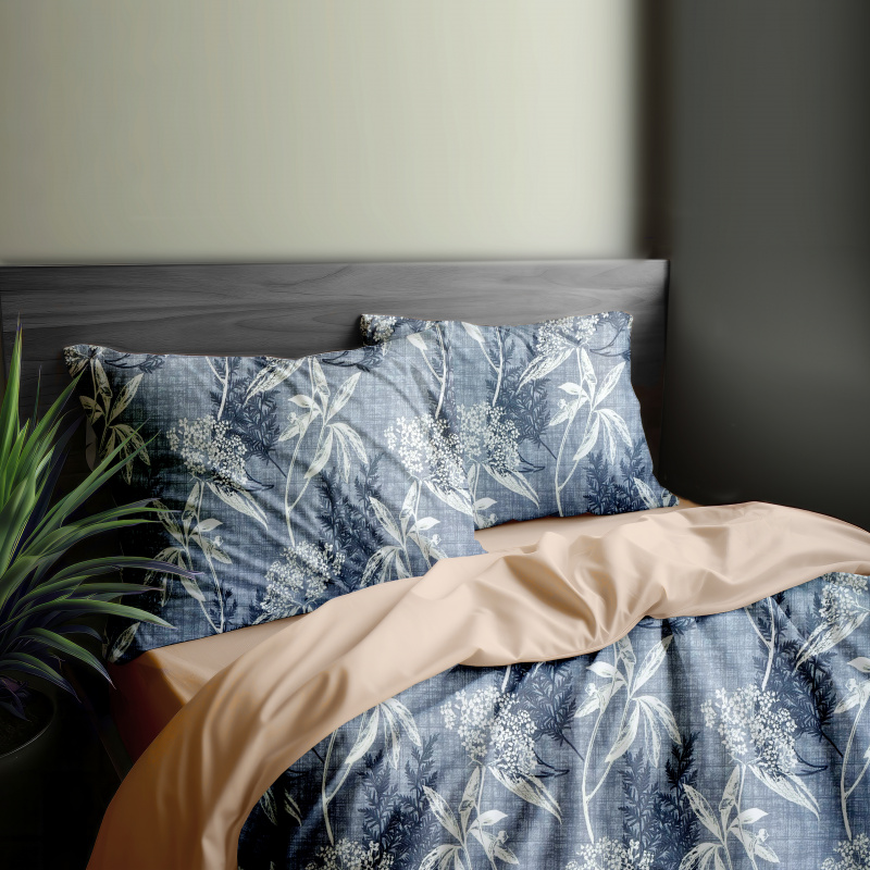 z jedné strány modré a bílé listy na modrém z druhé jednobarevná látka v béžové barvě.