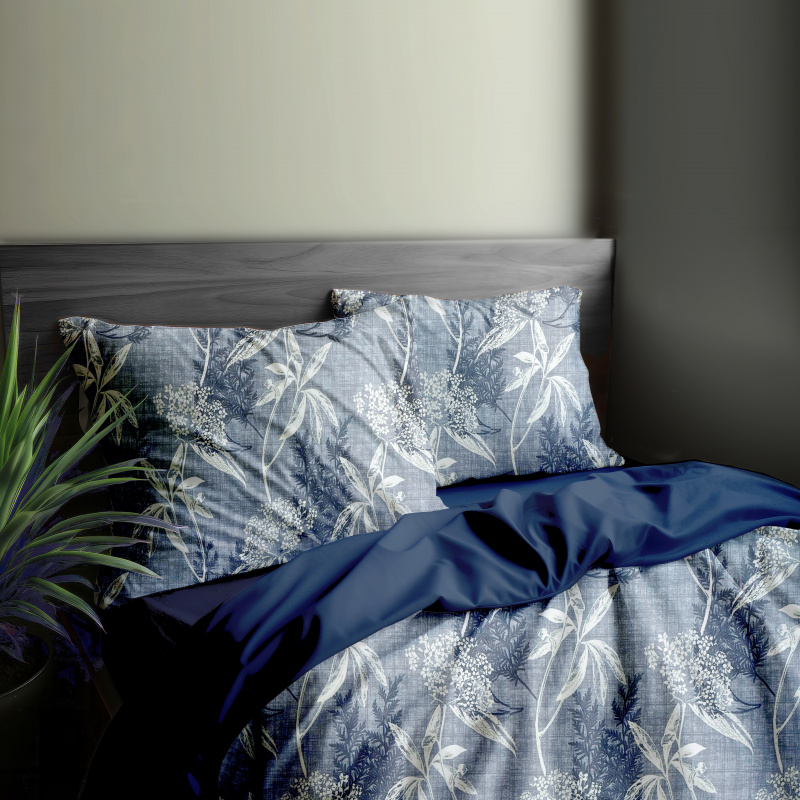 z jedné strány modré a bílé listy na modrém z druhé jednobarevná látka v modré barvě.