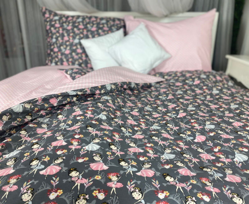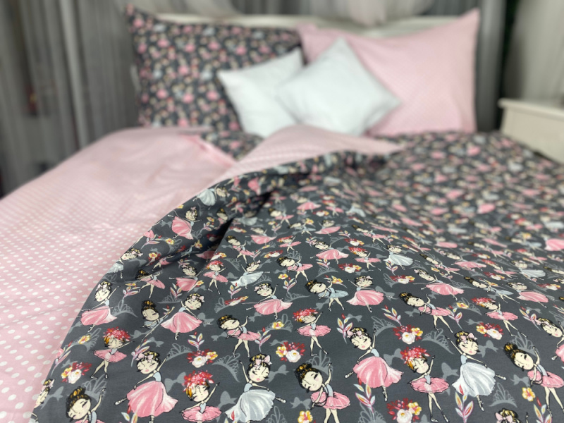 Ervi bavlněné povlečení oboustranné - baleríny na šedém/bílé puntíky na růžovém
