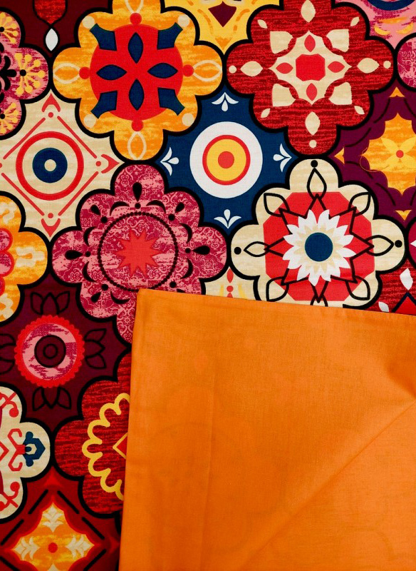 z jedné strány etnícký vzor z druhé jednobarevná látka v oranžové barvě.