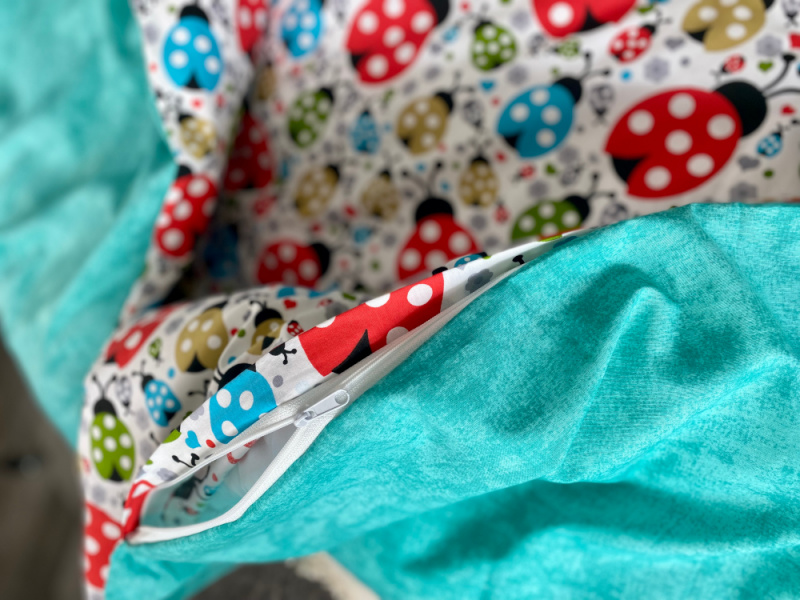 z jedné strány barevné berušky z druhé jednobarevná látka v tyrkysové barvě.