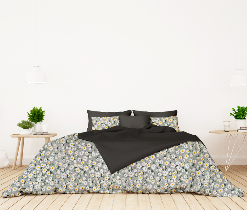 Bavlněné povlečení oboustranné - Heřmánkové pole na šedém/šedé. Toto elegantní povlečení je vyrobeno z kvalitní 100% bavlny, která zaručuje jemnost, komfort a dlouhou životnost. Nabízí praktický oboustranný design: jedna strana je ozdobena motivem heřmánkového pole s bílými květy a žlutými středy na šedém podkladu, zatímco druhá strana je jednobarevná šedá, což umožňuje snadnou změnu vzhledu ložnice podle nálady. Sada obsahuje povlak na polštář a přikrývku, které spolu dokonale ladí. Povlečení je snadno udržovatelné, ideální pro milovníky přírodních vzorů a moderních barev, které přinášejí harmonii do interiéru. Výborná volba pro stylové a pohodlné spaní!