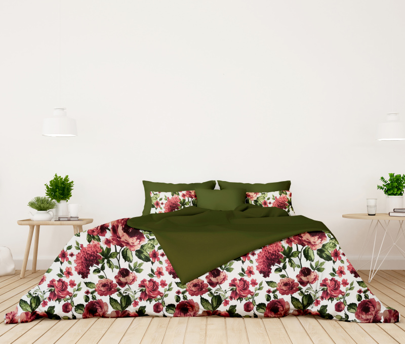 "Bavlněné povlečení oboustranné - hortenzie a pivoňky/olivové. Toto povlečení je vyrobeno z kvalitní 100% bavlny, která zajišťuje pohodlí, odolnost a snadnou údržbu. Jedna strana povlečení je zdobena krásným květinovým motivem hortenzií a pivoněk v jemných odstínech růžové a červené na světlém podkladu. Druhá strana je jednobarevná v olivovém odstínu, což umožňuje snadnou změnu vzhledu ložnice podle nálady. Ideální volba pro ty, kteří hledají kombinaci elegance a praktičnosti."