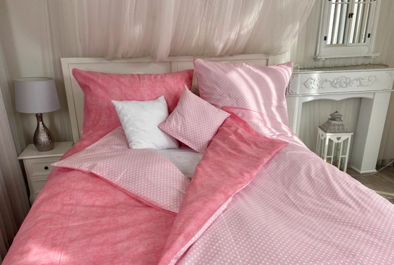z jedné strány bílé puntíky na růžovém z druhé jednobarevná látka v růžové barvě.