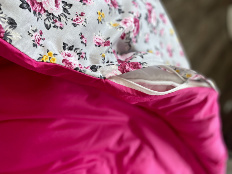 z jedné strány růžové růžičky na šedem z druhé jednobarevná látka v růžové barvě.