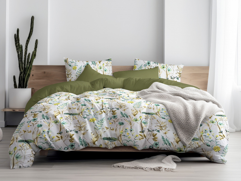 Toto povlečení je vyrobeno z kvalitní bavlny a nabízí oboustranný design. Jedna strana je zdobena motivem tyrkysové letní louky s různými květinami a rostlinami, zatímco druhá strana je v jednobarevné olivové barvě. Povlečení zahrnuje polštář a přikrývku, které jsou vidět na obrázku. Tento produkt je ideální pro ty, kteří chtějí přinést do své ložnice kousek přírody a zároveň mít možnost změnit vzhled podle nálady.