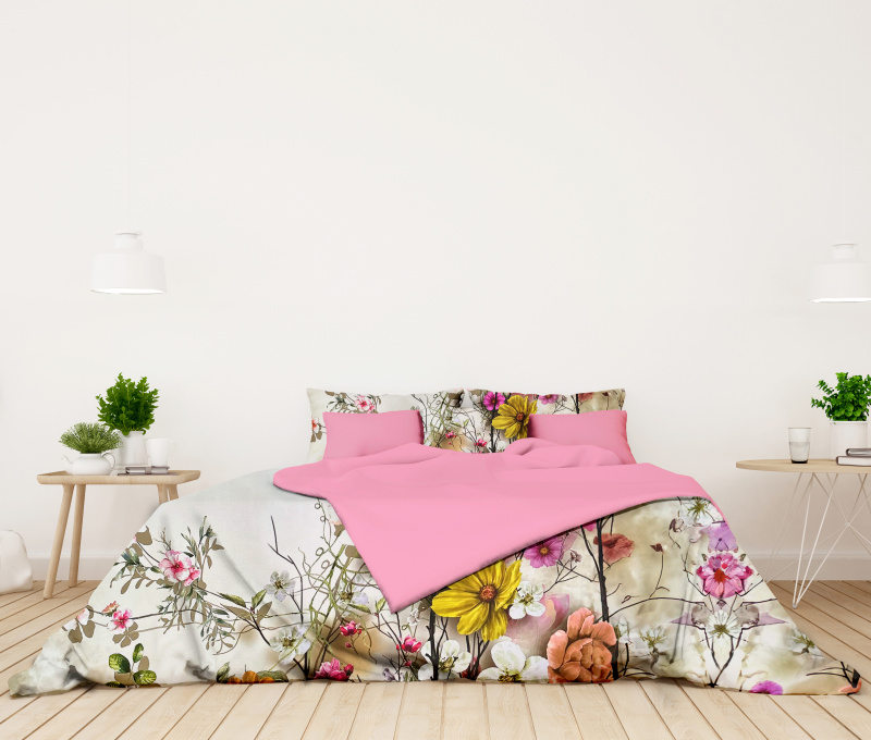 Ervi Bavlněné Saténové povlečení DELUXE DUO - Exotické květy/růžové