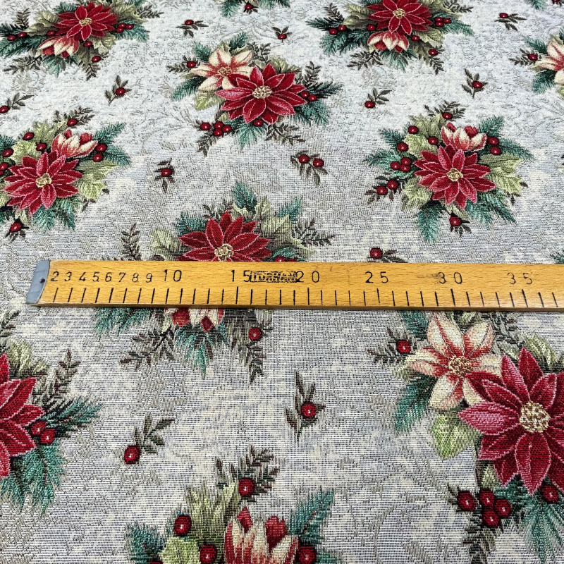 Tato gobelínová látka je perfektním spojením elegance a vánočního ducha. S nádherným květinovým vzorem na šedo krémovém podkladu, kde červené poinsettie jsou obklopeny jemnými zelenými lístky a bobulemi, přináší do interiéru slavnostní atmosféru.