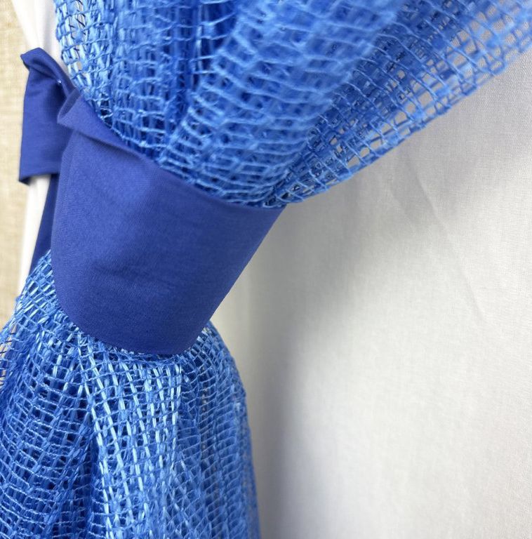 Použitý materiál je lehký, poloprůhledný a dobře propouští denní světlo, aniž by zatěžoval prostor. Boční záclony jsou doplněny praktickými úvazy, které umožňují snadné tvarování a regulaci světla.