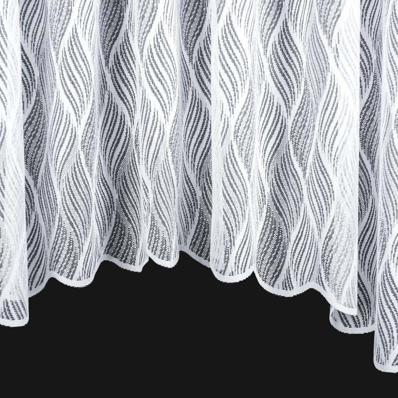 Zdobená žakárová záclona v bílé barvě tvarovaná do oblouku s našitou řasící páskou 2,5 cm.