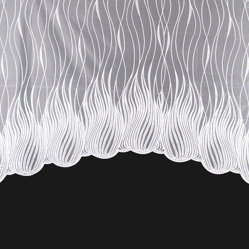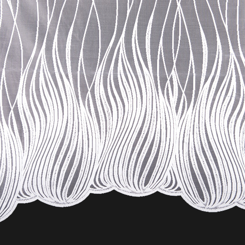 Zdobená žakárová záclona v bílé barvě tvarovaná do oblouku s našitou řasící páskou 2,5 cm.