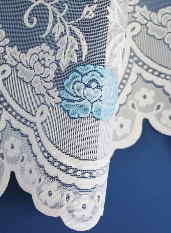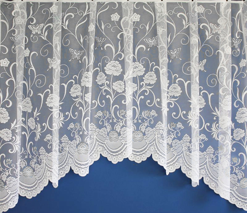 Oblouková záclona 7514 motýl, 180x320 cm, je vyrobena z jemného bílého materiálu s bohatým květinovým vzorem a modrými motýly. Záclona má obloukový spodní okraj, který dodává elegantní vzhled. Vzor zahrnuje bílé květiny a listy, rozmístěné po celé ploše záclony, a modré motýly, které dodávají barevný akcent.