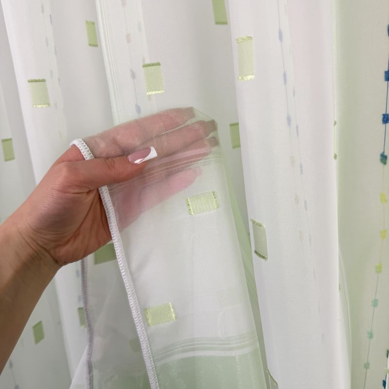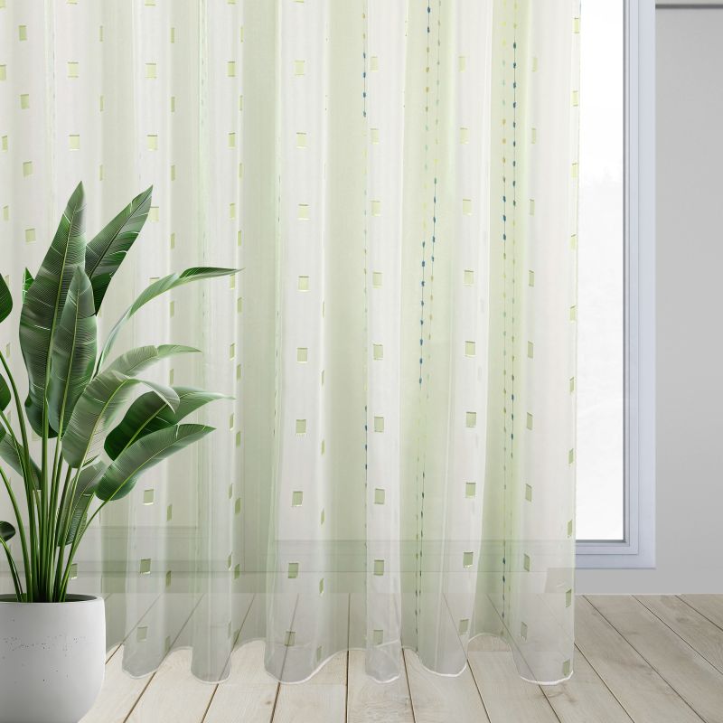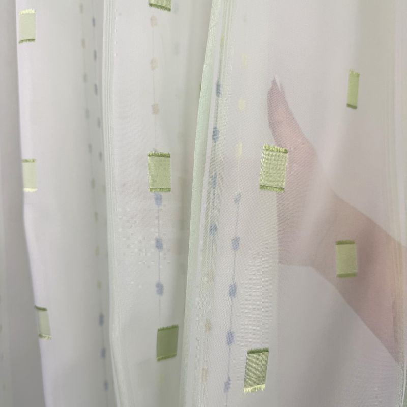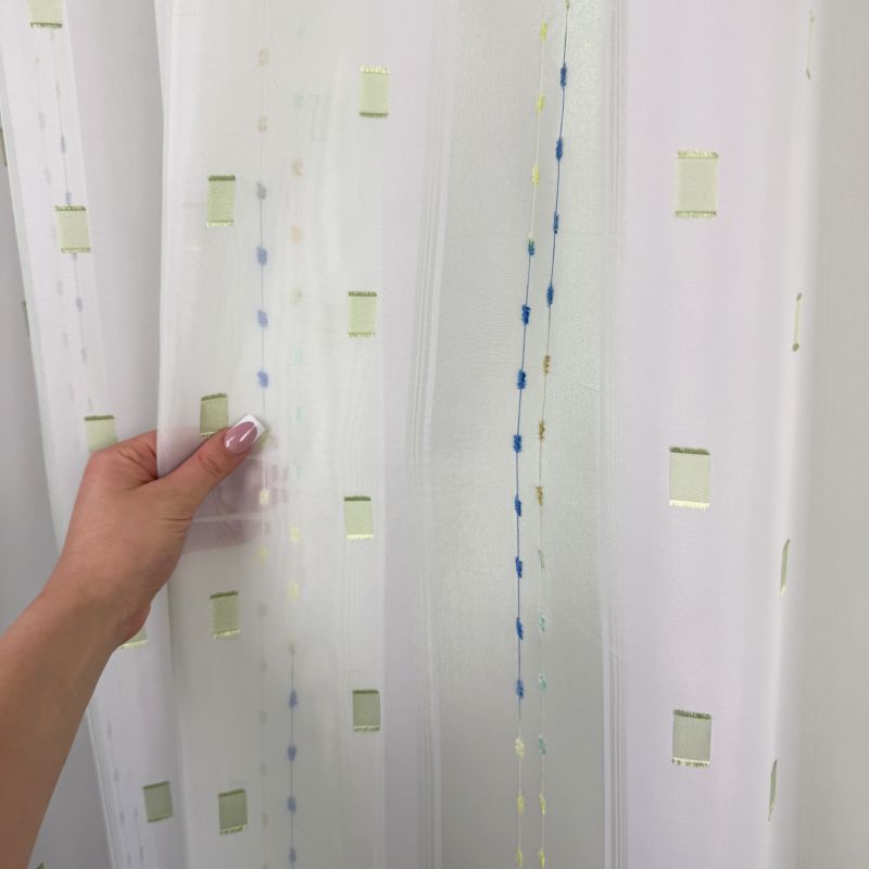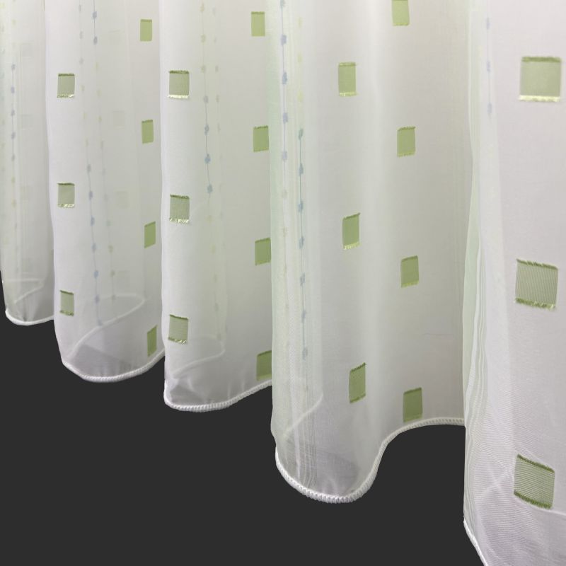 Voálová záclona v kombinaci barev zelené a bílé s vetkanými barevnými kostičkami a nití s olůvkem.