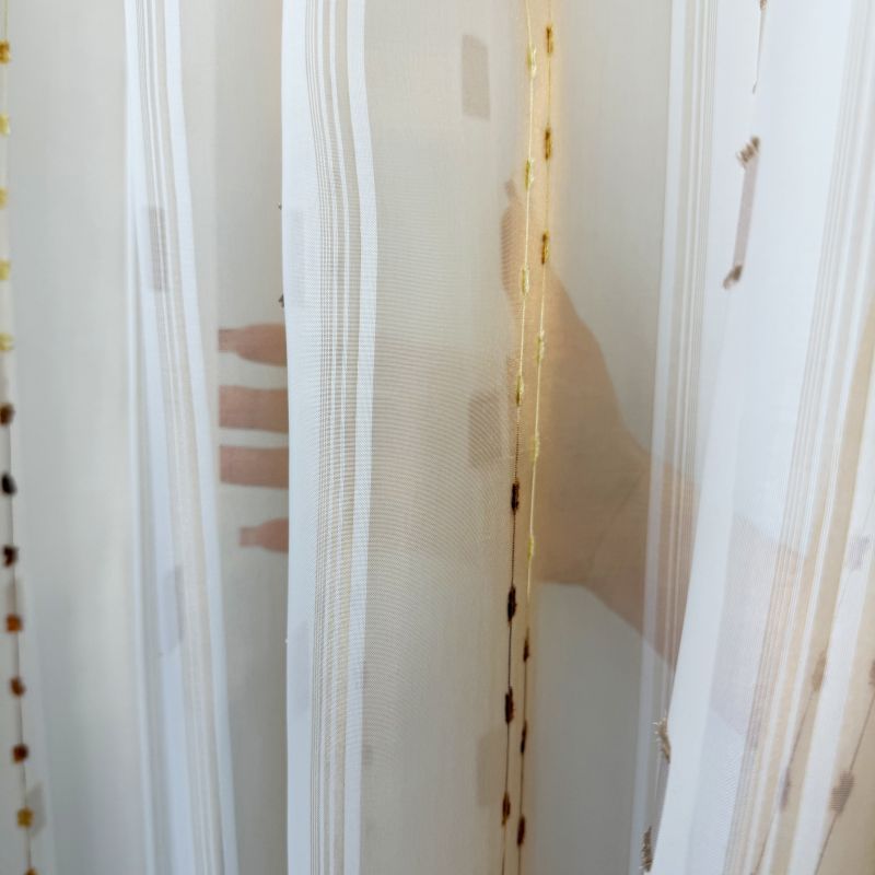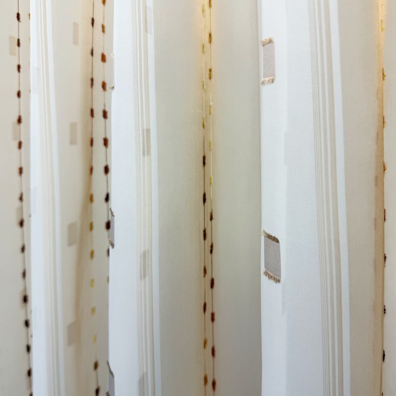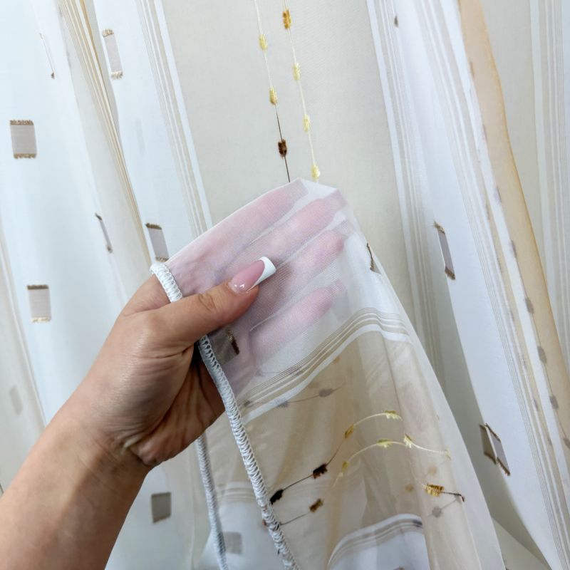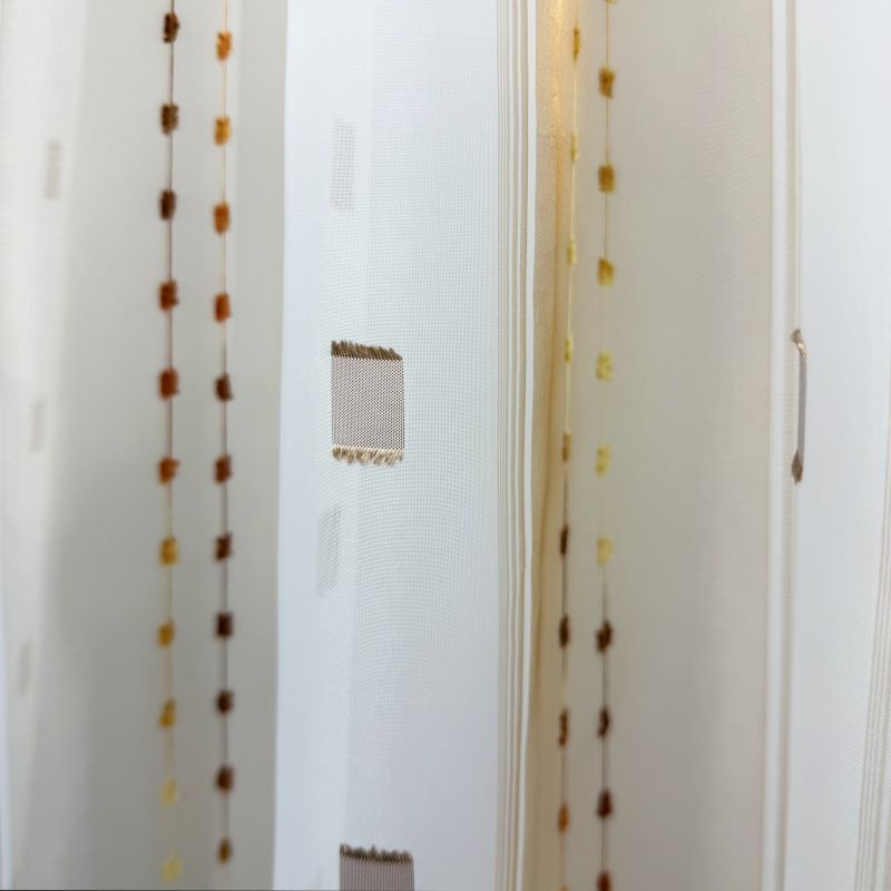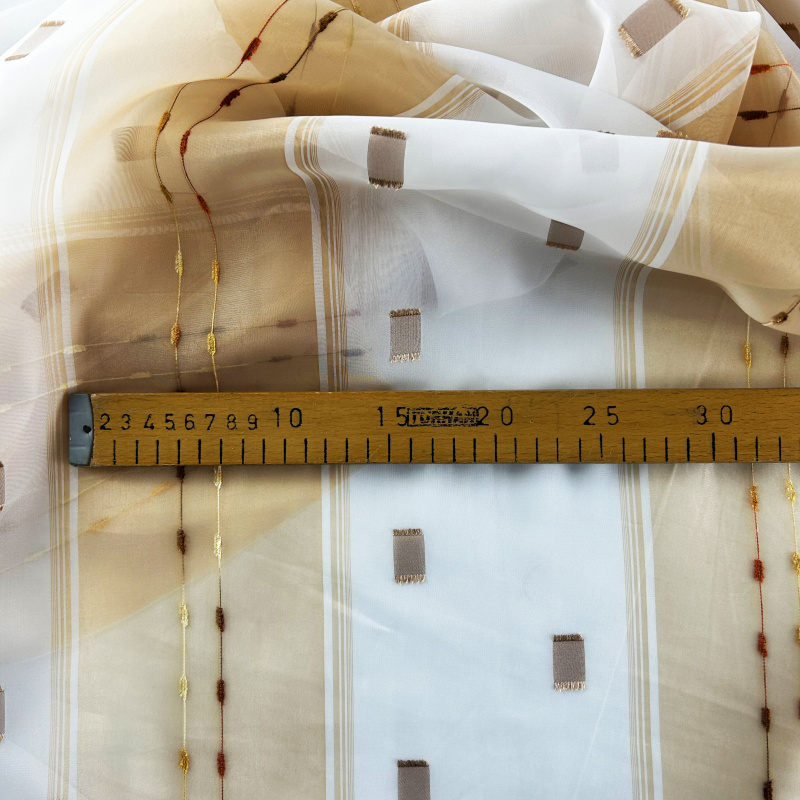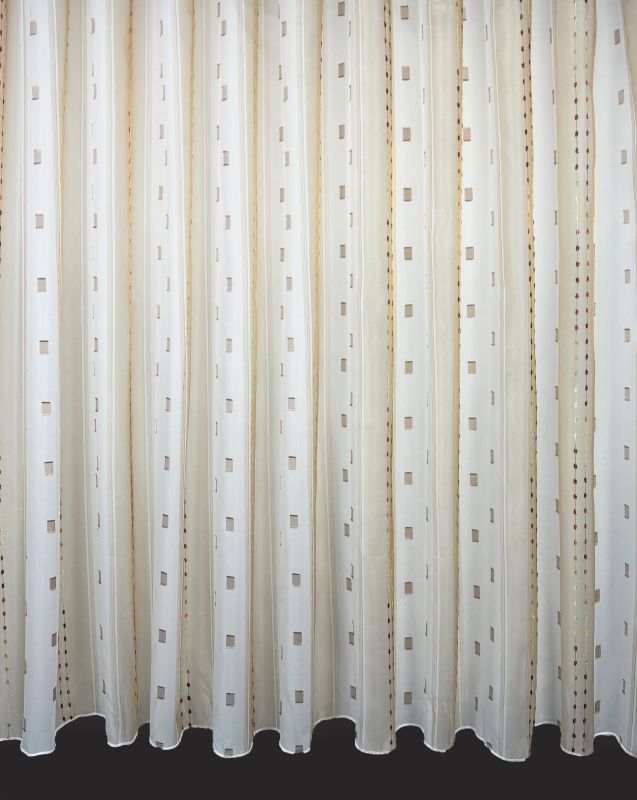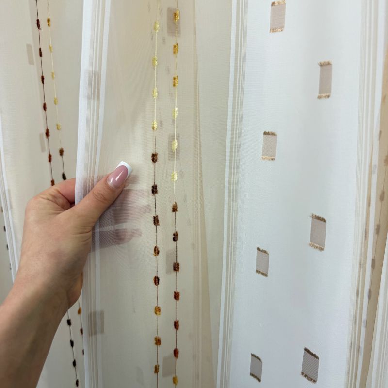 Voálová záclona v kombinaci barev hnědá a bílá s vetkanými barevnými kostičkami a nití s olůvkem.