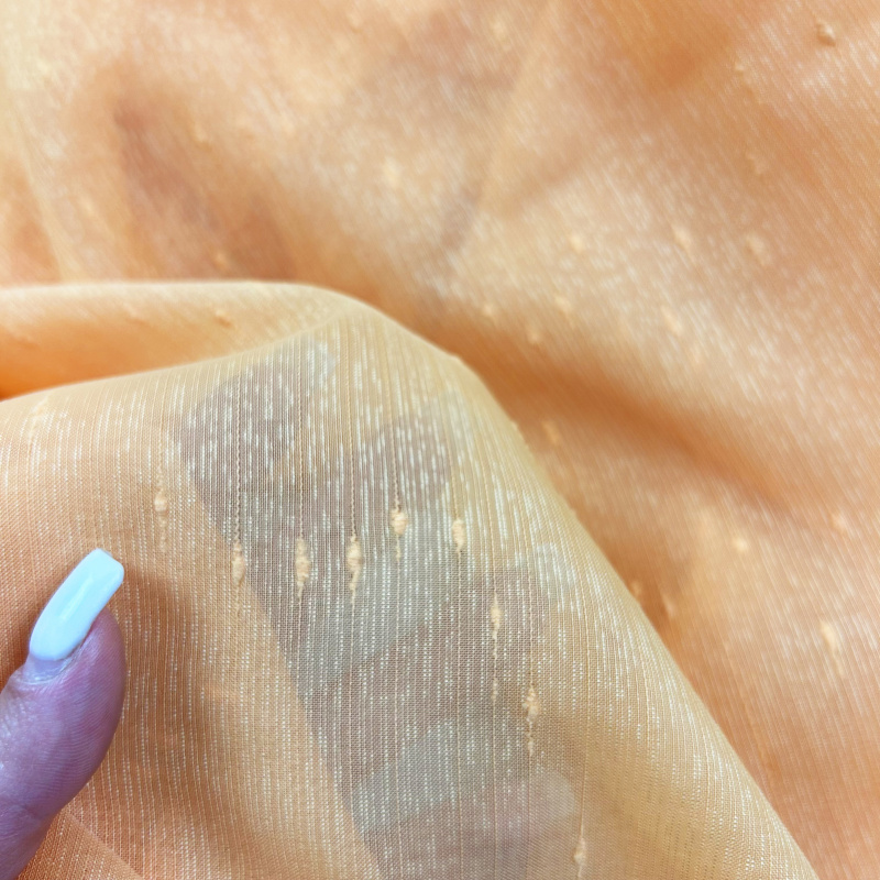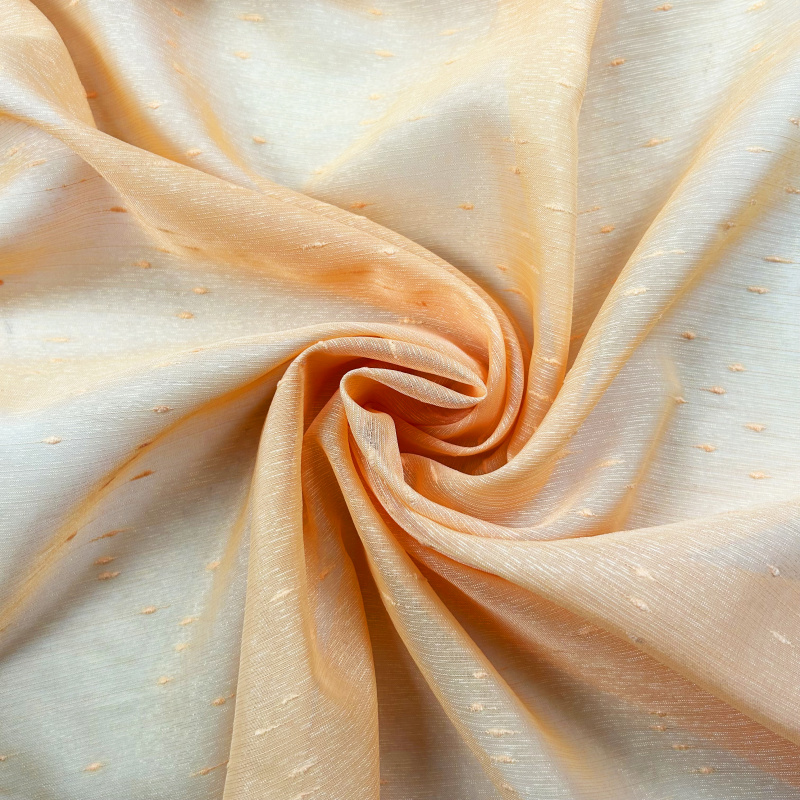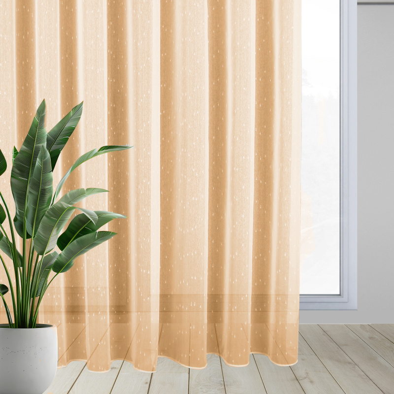 Voálová meruňková záclona prší / Rain je moderním a svěžím doplňkem do každého interiéru. Tato záclona je vyrobena z jemného voálu v meruňkové barvě a je zdobena vzorem, který připomíná padající déšť. Látka propouští dostatek světla, ale zároveň poskytuje pocit soukromí. Ideální volba pro obývací pokoje, ložnice nebo kuchyně, kde chcete vytvořit útulnou a přirozenou atmosféru.
