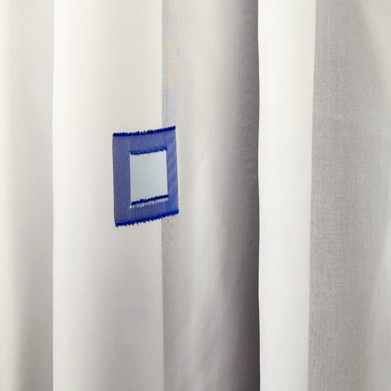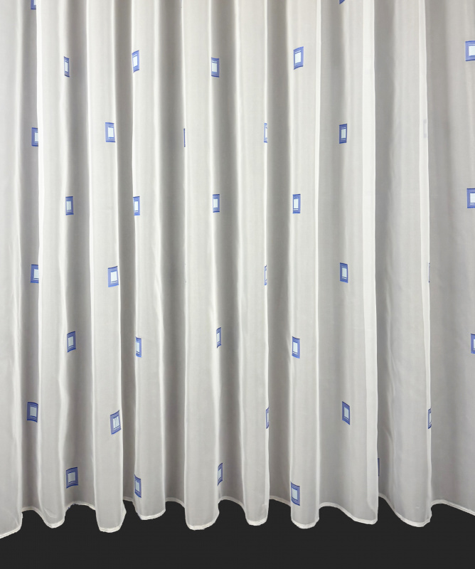 Lehká bílá záclona s jemným vzorem modrých obdélníků.
