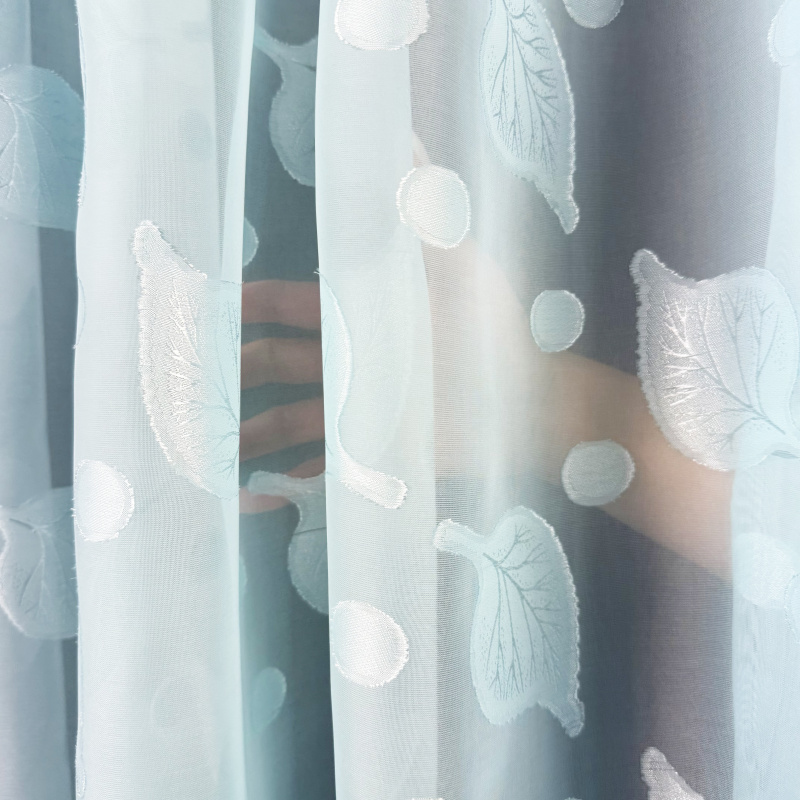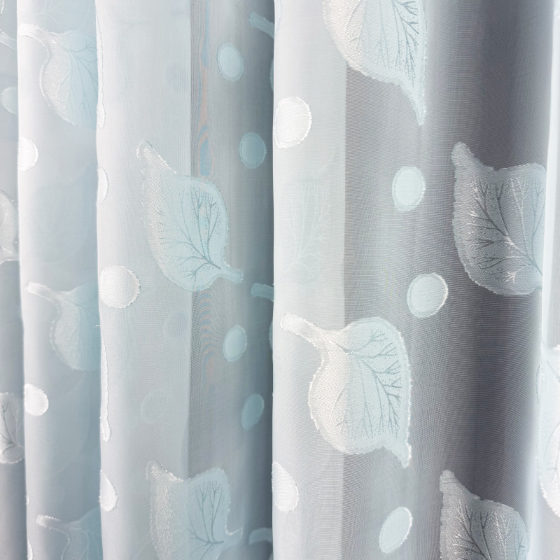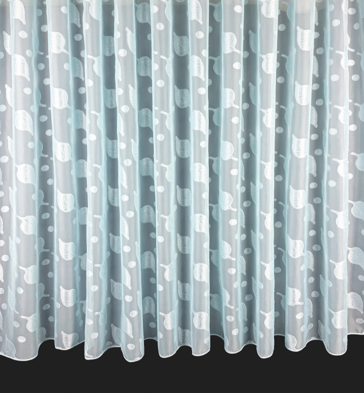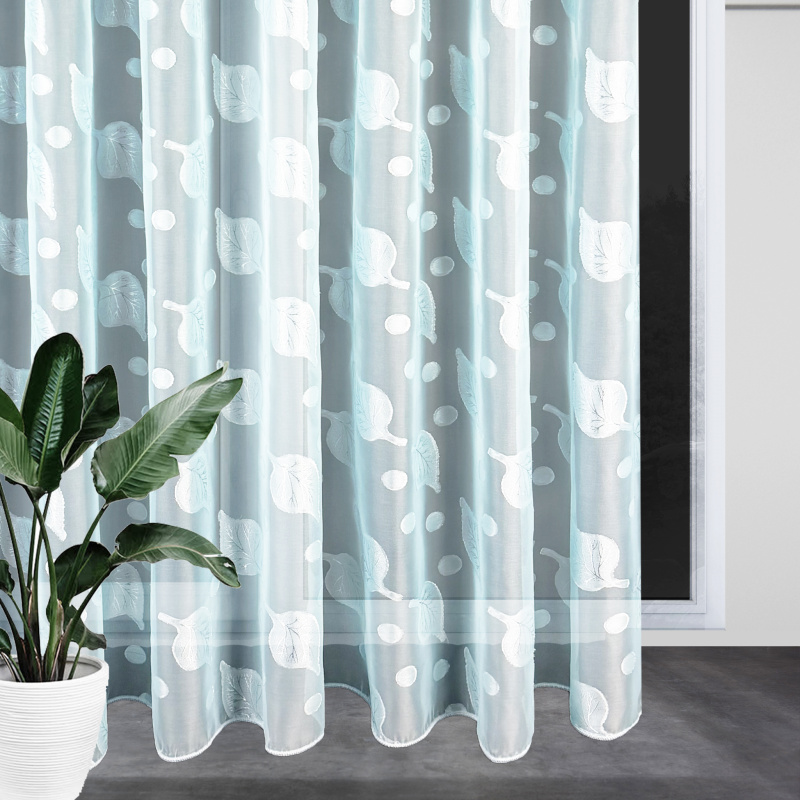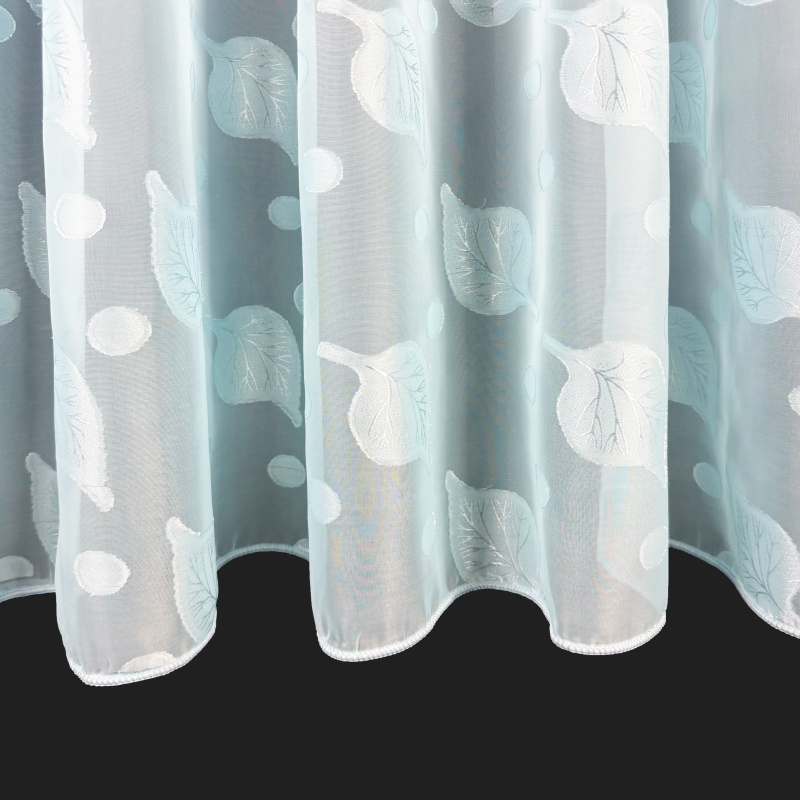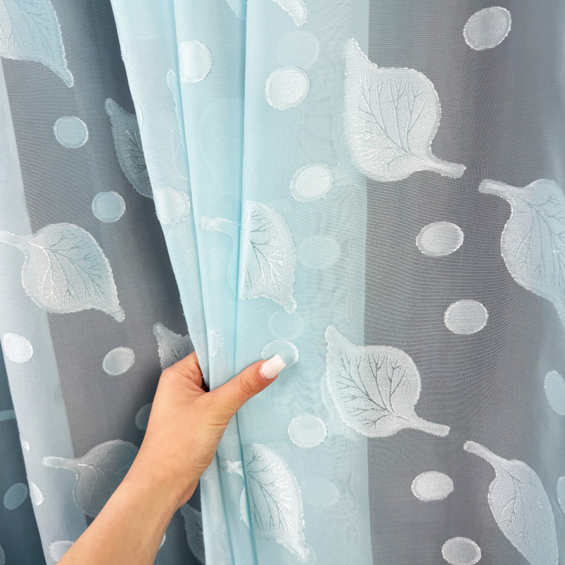 Voálová záclona s olůvkem listy – modrá je lehká a vzdušná textilie s decentním motivem listů v modrém odstínu, kterou můžete použít jako stylový doplněk do různých typů interiérů. Mírně průsvitný materiál propouští přirozené světlo a zároveň přispívá k příjemnému pocitu soukromí, zatímco olůvko ve spodní části pomáhá zácloně lépe držet tvar při zavěšení. Záclona se prodává na metráž, takže si ji můžete upravit přesně podle výšky svých oken