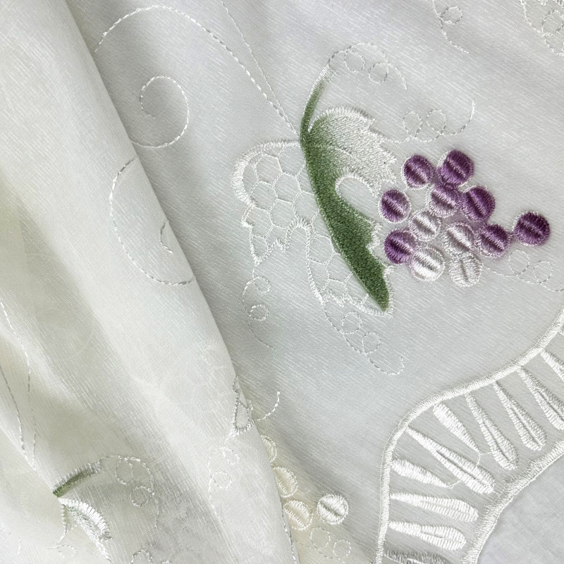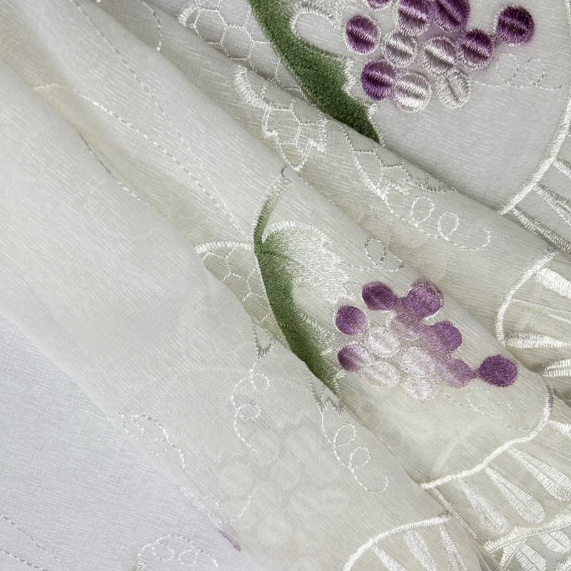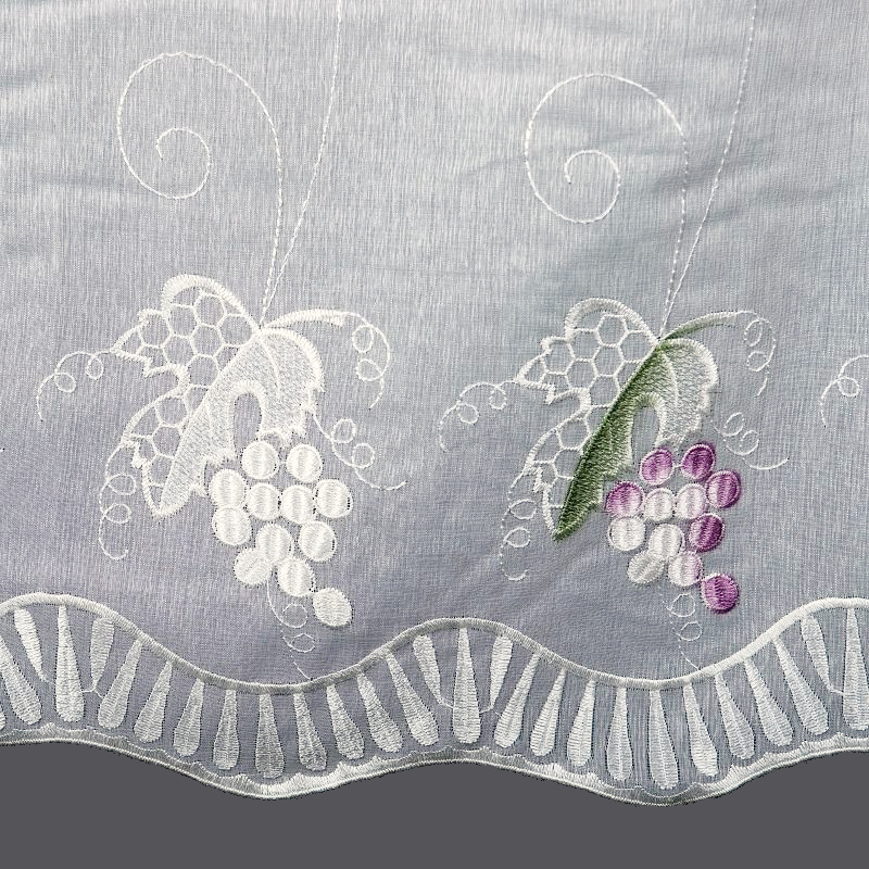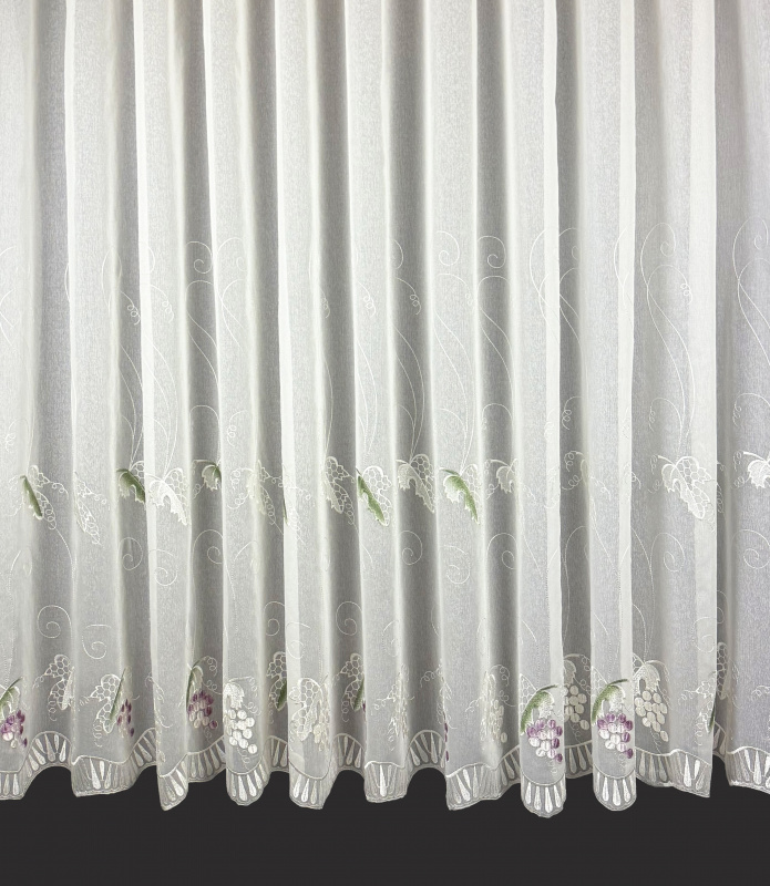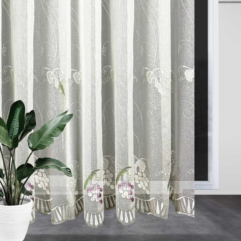Voálová záclona krémová s výšivkou 5049 - Hroznové víno je dokonalou volbou pro zútulnění vašeho interiéru. Záclona je vyrobena z jemného voálu v krémové barvě, který zajišťuje lehkost a průsvitnost. Je ozdobena elegantní výšivkou s motivem hroznového vína v odstínech fialové a zelené, což dodává místnosti dekorativní a přírodní nádech. Tento designový prvek je ideální pro obývací pokoj, kuchyň nebo jiný interiér.