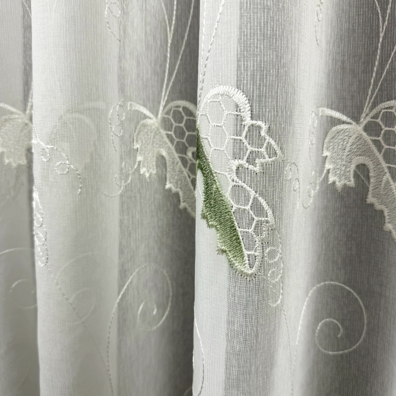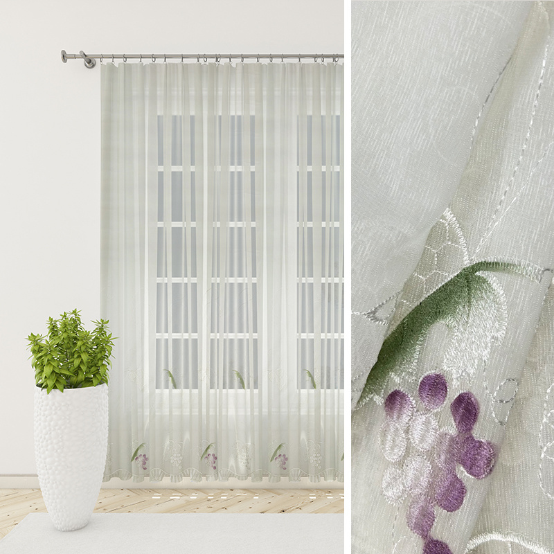 Voálová záclona v smetanové barvě s výšivkou s motivem hroznového vína. Zavěšení na žabky, po našití řasící pásky lze zavěsit na háčky.