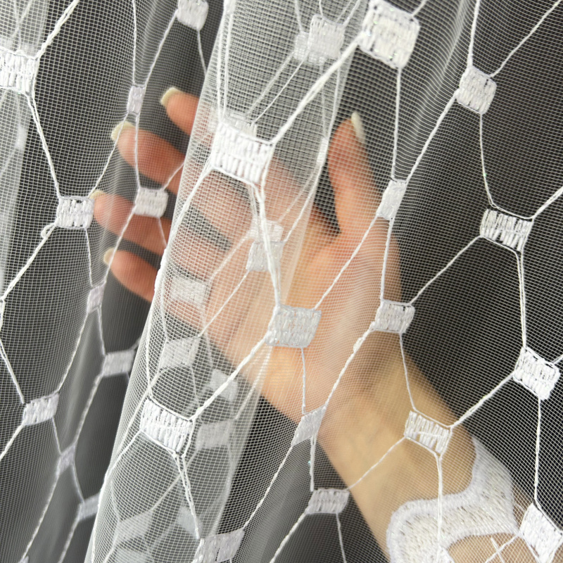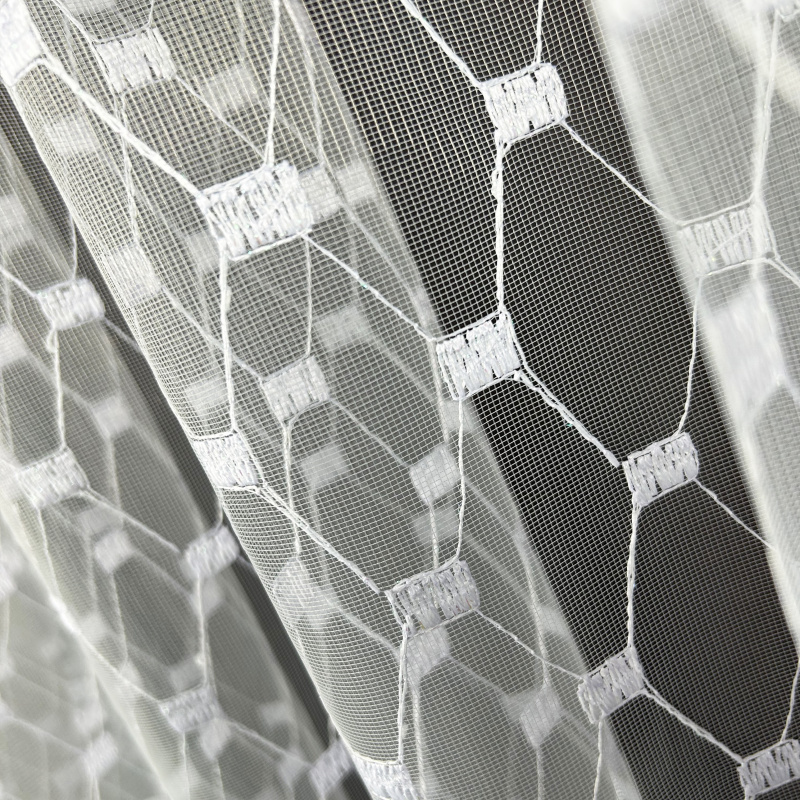 Vyšívaná záclona bílá 3010, metráž, je dokonalým doplňkem každého interiéru. Tato záclona je vyrobena z kvalitního bílého materiálu a zdobena jemným geometrickým vyšívaným vzorem, který vytváří moderní a elegantní vzhled. Průhledná struktura záclony propouští dostatek světla, přičemž vzor zajišťuje příjemné soukromí. Dekorativní lemování na spodním okraji dodává zácloně na sofistikovanosti.