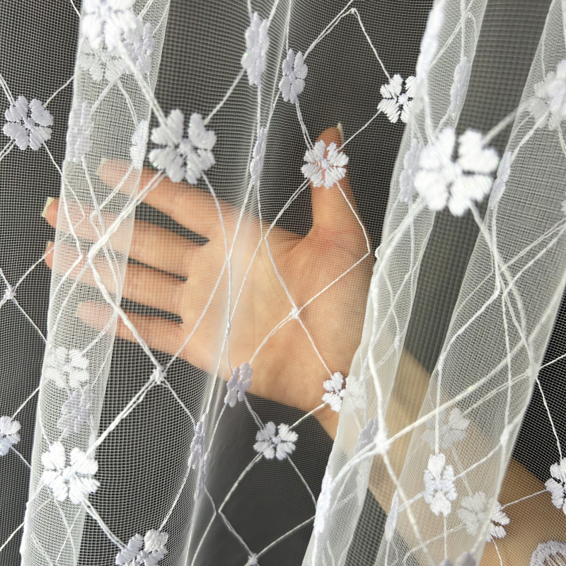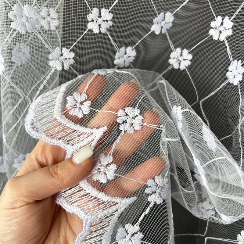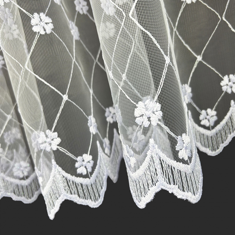 Vyšívaná záclona bílá M37, metráž, je skvělým doplňkem každého interiéru. Tato záclona je vyrobena z jemného bílého materiálu, který je ozdoben pravidelně rozmístěnými květinovými vzory propojenými diagonálními liniemi. Tento design vytváří elegantní a vzdušný vzhled, který dodá vašemu prostoru svěžest a lehkost. Ozdobný lem s jemnými obloučky na spodním okraji přidává zácloně na sofistikovanosti.