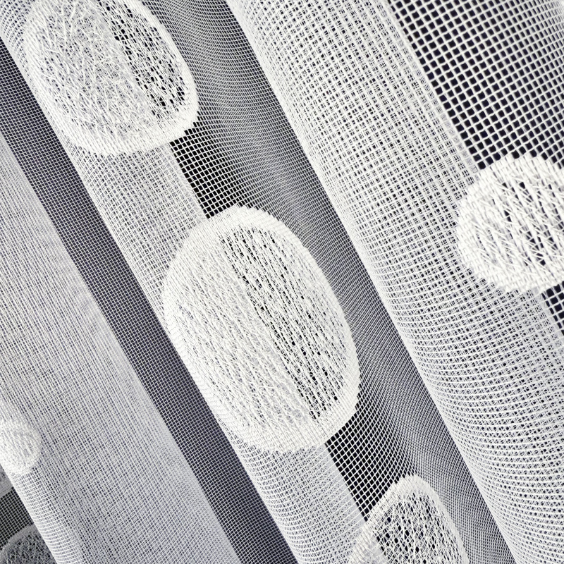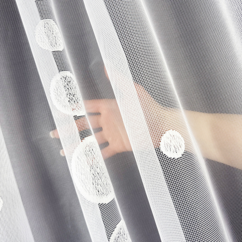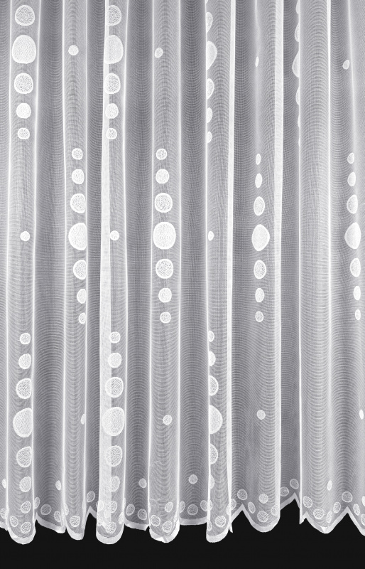 Žakárová záclona bílá 15260, metráž, je vyrobena z jemného bílého žakárového materiálu s elegantním vzorem kruhů různých velikostí. Díky průsvitnému vzhledu dodává interiéru světlost a lehkost, zároveň zajišťuje dostatečné soukromí. Spodní okraj záclony je zakončen vlnkovým lemem s vyšívanými kruhy, což zvyšuje její estetickou hodnotu.