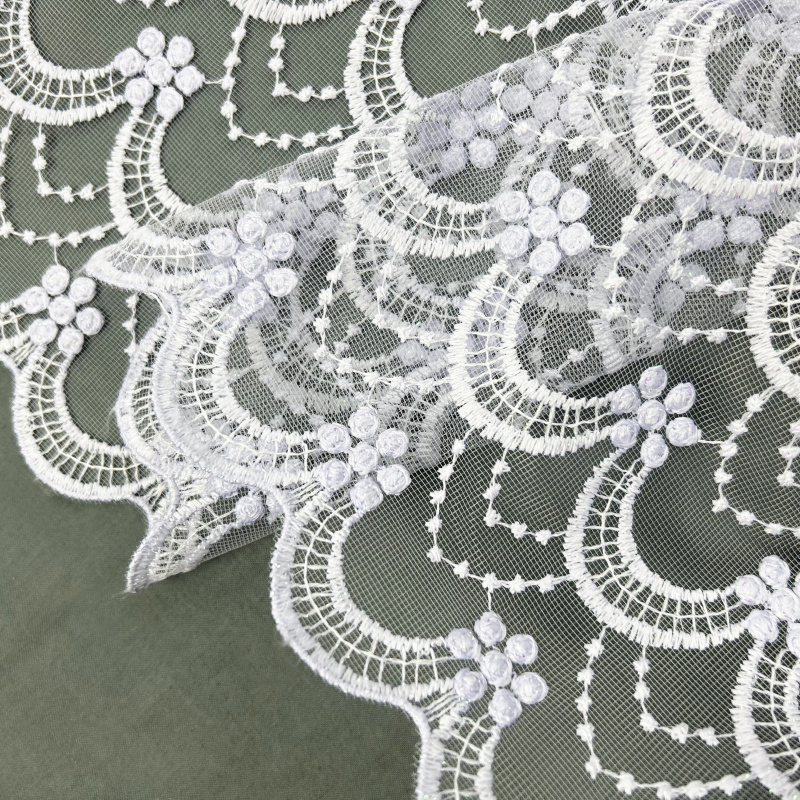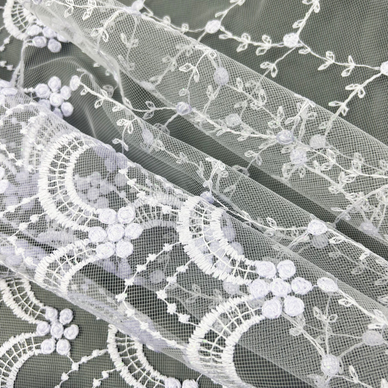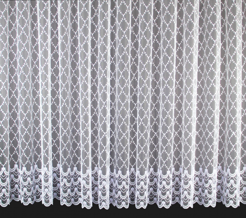 Žakárová záclona bílá 6958, metráž, je vyrobena z jemného bílého žakárového materiálu s elegantním vzorem. Vzor tvoří pravidelně se opakující geometrické tvary, které dodávají zácloně klasický a sofistikovaný vzhled. Spodní okraj záclony je zdoben jemnými obloučky, které přidávají na její estetické hodnotě. Tato záclona je ideální pro použití v různých interiérech, kde přidá místnosti svěžest a lehkost.