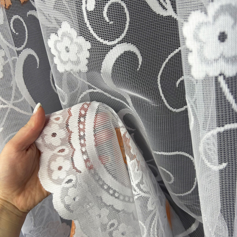 Žakárová záclona v bílé barvě se vzorem.