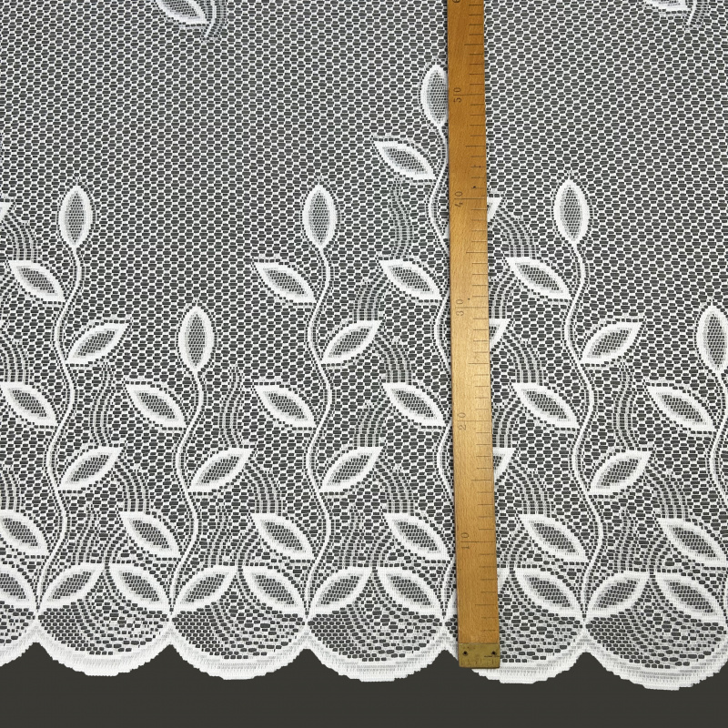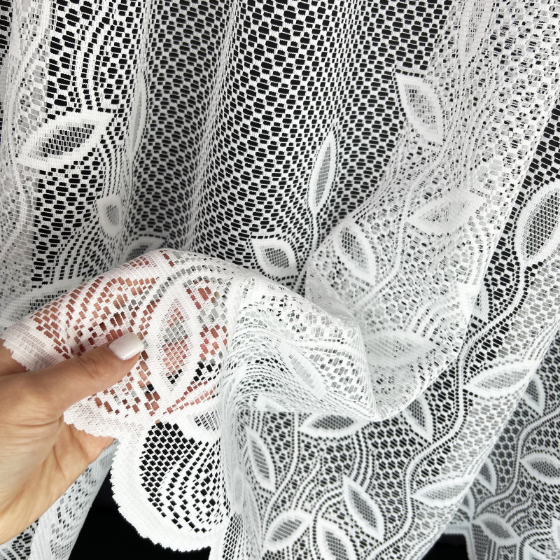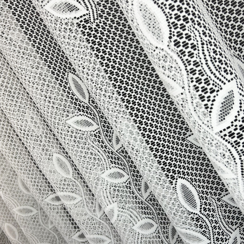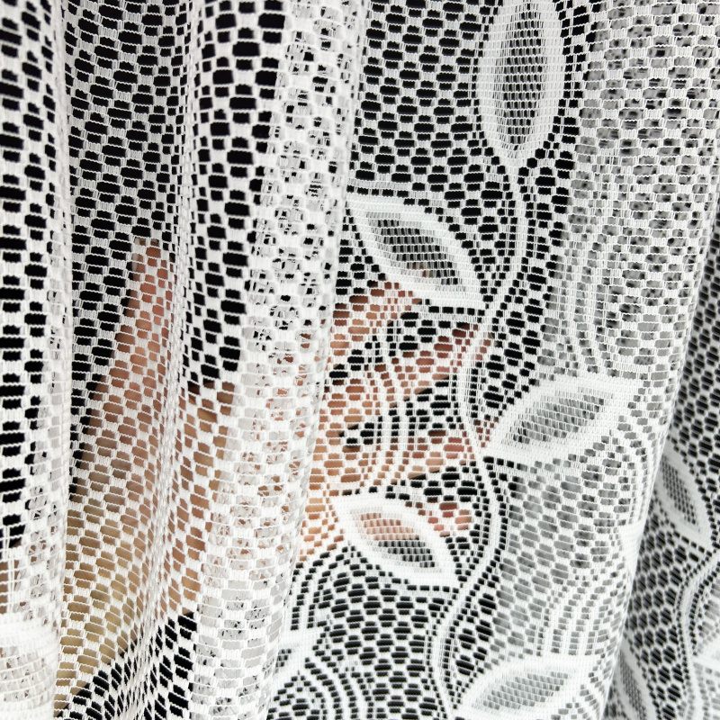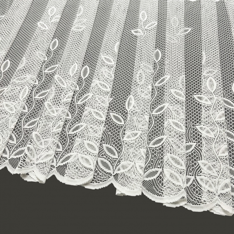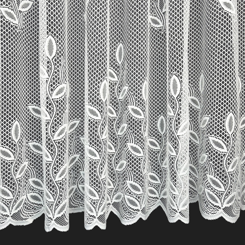 Žakárová záclona bílá 3721, metráž je vyrobena z kvalitního bílého žakárového materiálu s jemným vzorem listů a geometrickými tvary. Záclona je průsvitná, což umožňuje přirozené světlo pronikat do místnosti, zatímco poskytuje dostatečné soukromí. Vertikální pruhy s motivem listů přidávají eleganci a stylovost, což činí tuto záclonu ideálním doplňkem pro moderní i klasické interiéry.