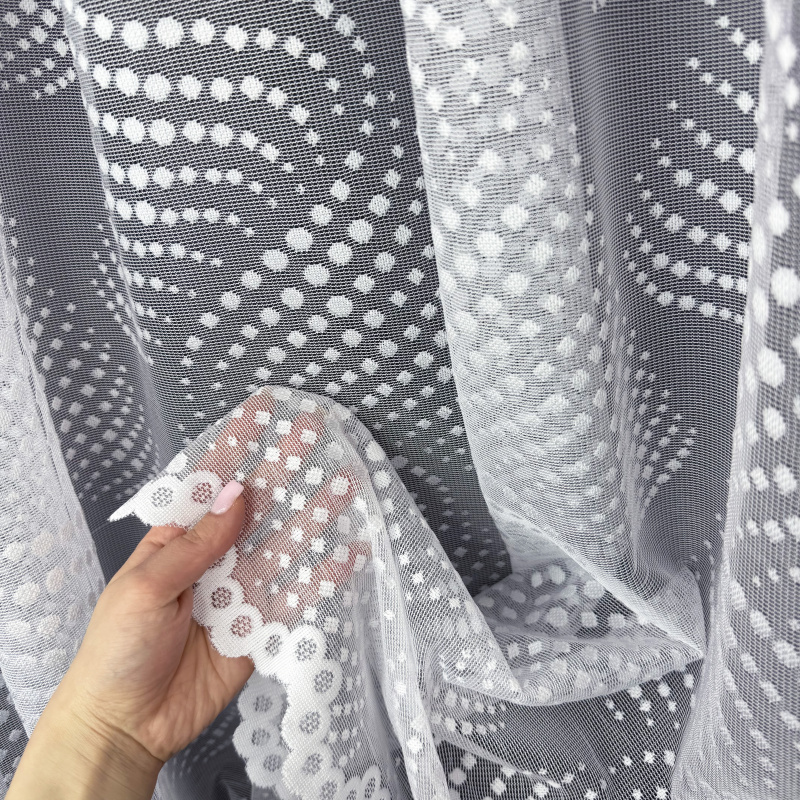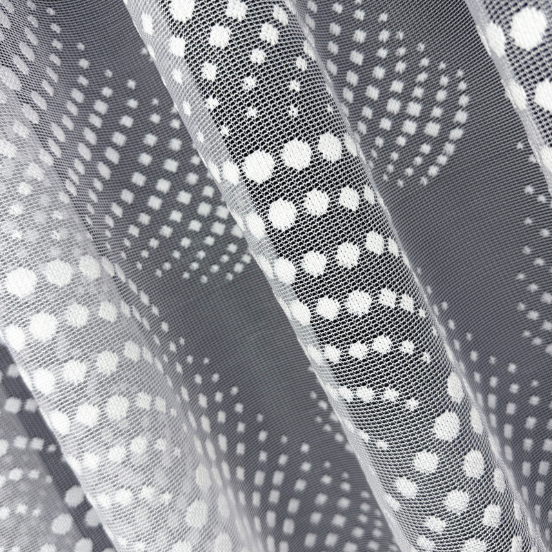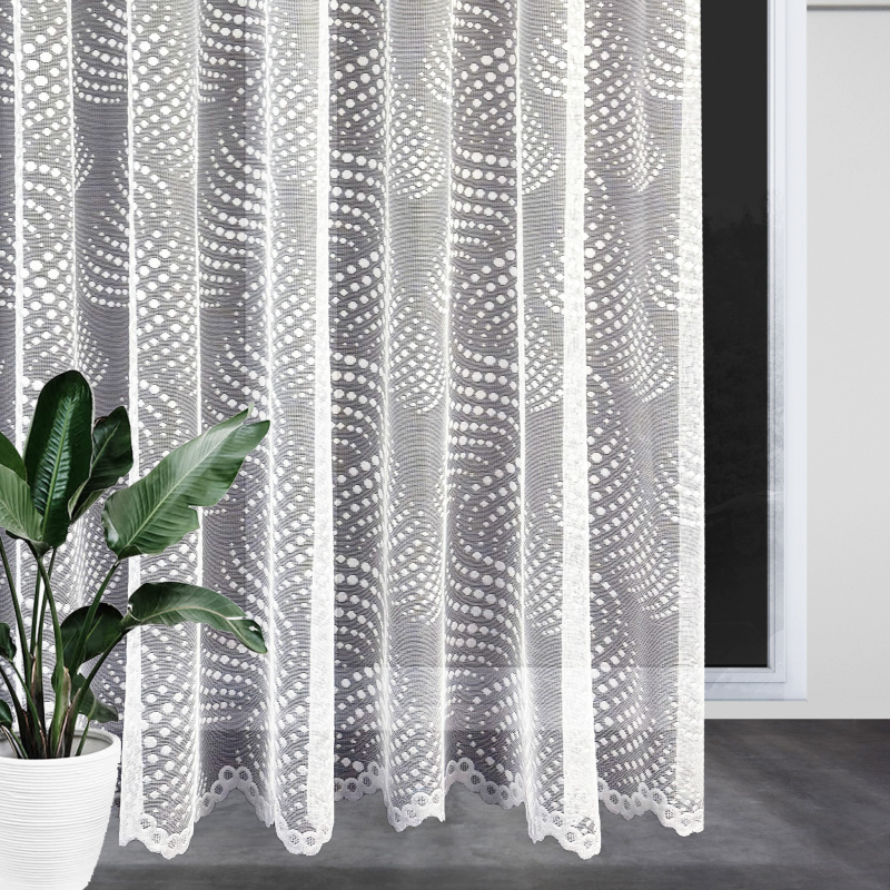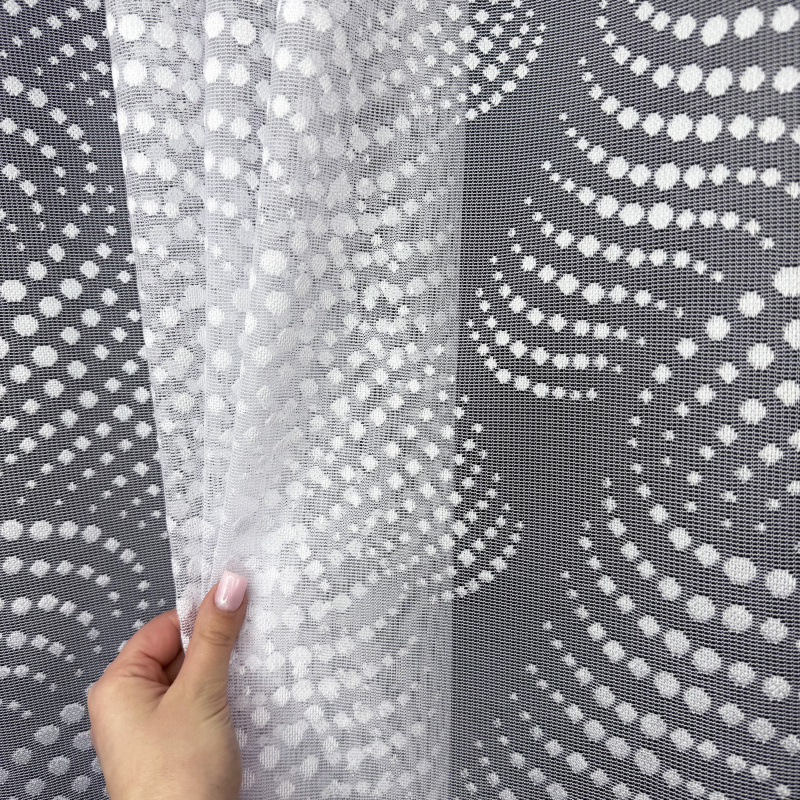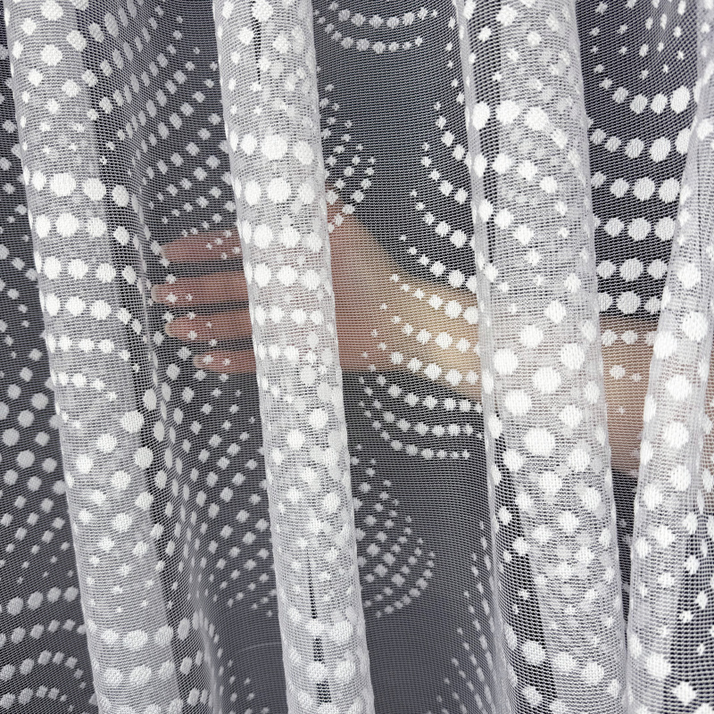Žakárová záclona bílá 7182, metráž, je vyrobena z jemného bílého žakárového materiálu. Tato záclona má elegantní a moderní vzor tvořený drobnými tečkami a vlnkami, který dodává interiéru svěžest a lehkost. Okraje záclony jsou zakončeny ozdobným lemem, který přidává na estetické hodnotě. Záclona je ideální pro použití v různých interiérech, jako jsou obývací pokoj, ložnice, kuchyně nebo kancelář. Dostupná je v metráži, což umožňuje přizpůsobení délky podle potřeby zákazníka.