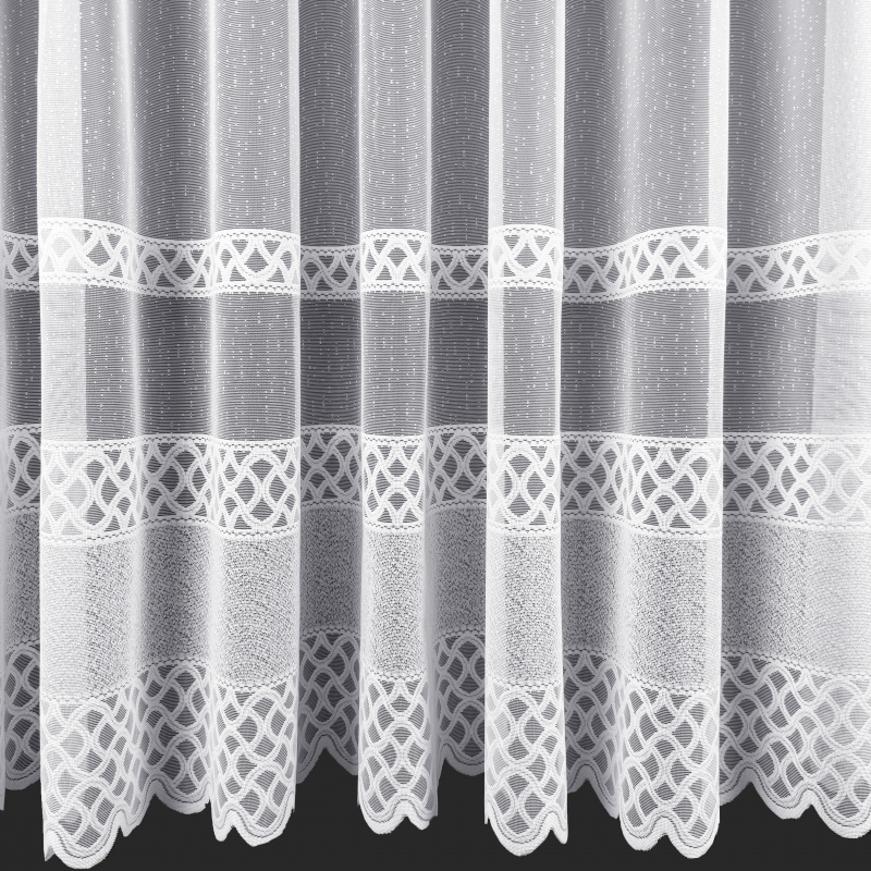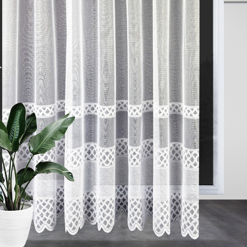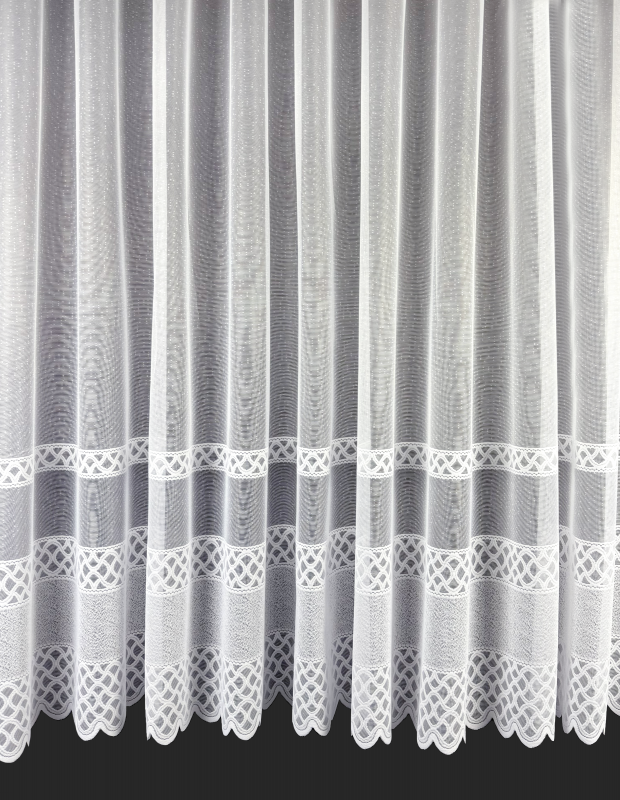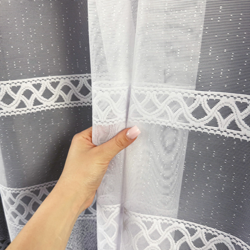 Žakárová záclona bílá 7627, metráž. Tato záclona je vyrobena z jemného bílého materiálu s kvalitním žakárovým vzorem. Vzor tvoří horizontální pruhy s geometrickým motivem, které dodávají zácloně moderní a elegantní vzhled. Průhledná textura záclony umožňuje přirozený průchod světla do místnosti, zároveň však poskytuje určitou úroveň soukromí. Díky možnosti zakoupení na metráž lze záclonu přizpůsobit různým velikostem oken, což ji činí univerzální volbou pro dekoraci obývacího pokoje, ložnice či kuchyně. Skvělý doplněk pro vytvoření svěžího a stylového interiéru.