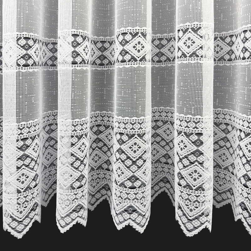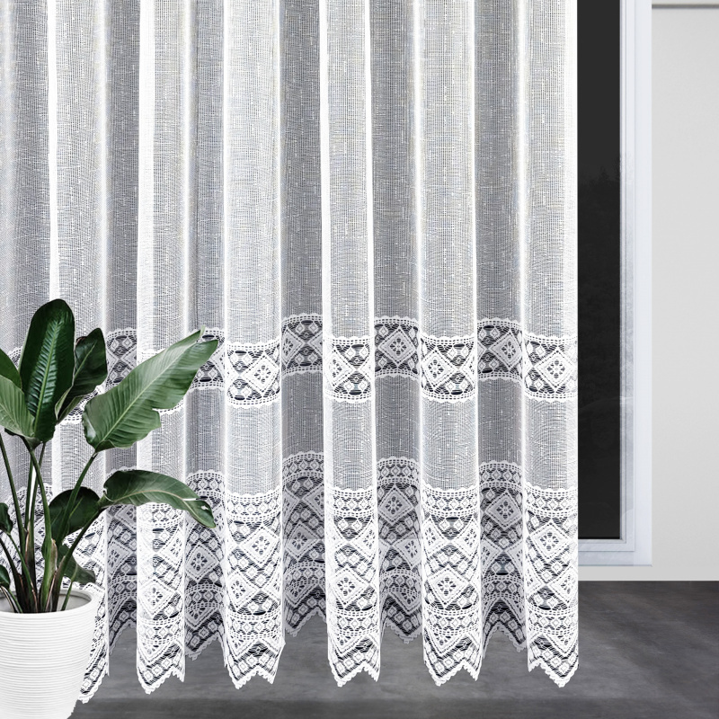Žakárová záclona bílá 7828, metráž. Tato záclona je vyrobena z kvalitního žakárového materiálu a má elegantní bílou barvu. Vzor záclony kombinuje geometrické tvary a květinové motivy, které jsou rovnoměrně rozmístěny po celé ploše, což vytváří harmonický a stylový vzhled. Průsvitný materiál umožňuje dostatek světla do místnosti a zároveň poskytuje soukromí. Spodní okraj je zakončen ozdobným lemováním s cikcakovým vzorem, což zdůrazňuje její jedinečný design. Ideální volba pro obývací pokoj, ložnici nebo kuchyni, která dodá interiéru svěží a elegantní vzhled.