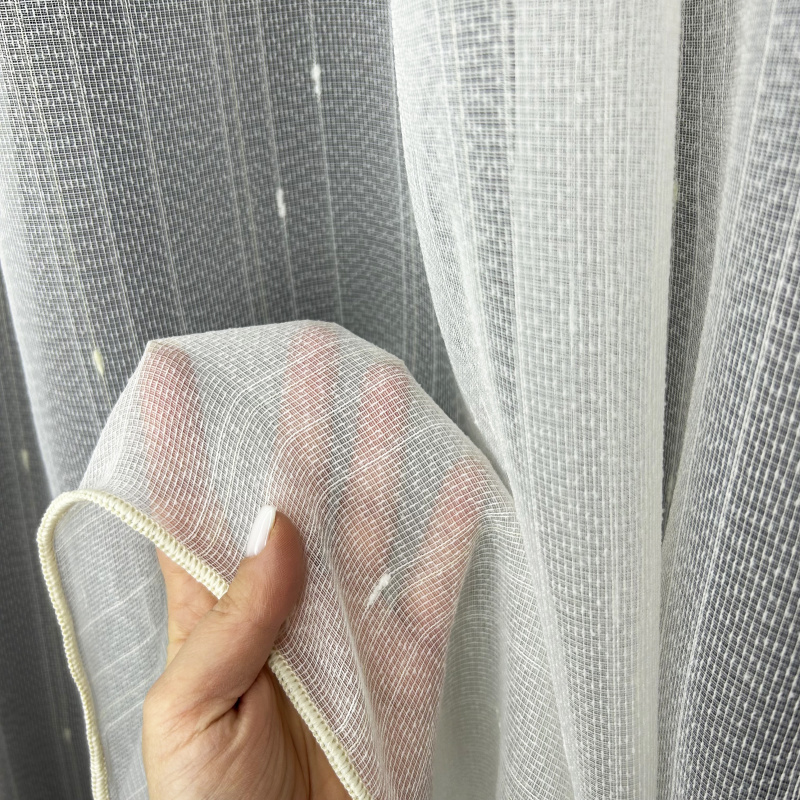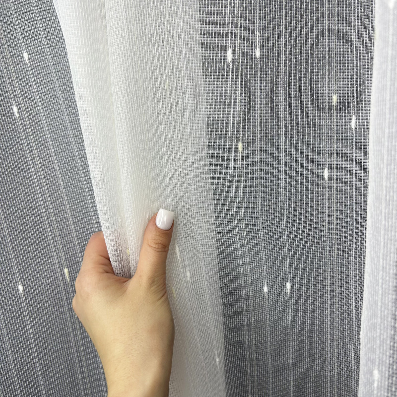 Struktura látky připomíná tenkou síťovinu, na které jsou nepravidelně rozmístěny malé bílé body nebo vlákna v bílé a smetanové barvě, což vytváří zajímavý textilní efekt.