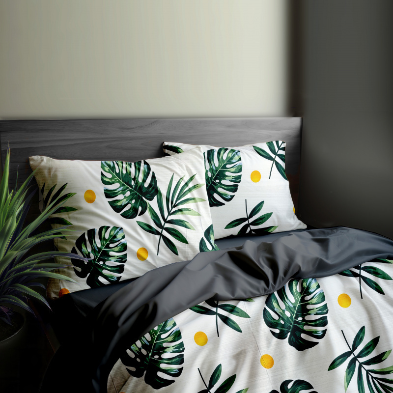 "Zvýhodněná Sada Bavlněného DUO povlečení s Prostěradlem - listy monstery/tmavě šedé. Tato sada obsahuje povlečení s motivem zelených listů monstery a žlutých kruhů na bílém podkladu, doplněné tmavě šedým prostěradlem. Povlečení je vyrobeno z kvalitní bavlny, která zajišťuje pohodlí a dlouhou životnost. Tmavě šedé prostěradlo dodává elegantní kontrast k barevnému povlečení. Tato sada je ideální volbou pro ty, kteří hledají stylové a pohodlné ložní prádlo."