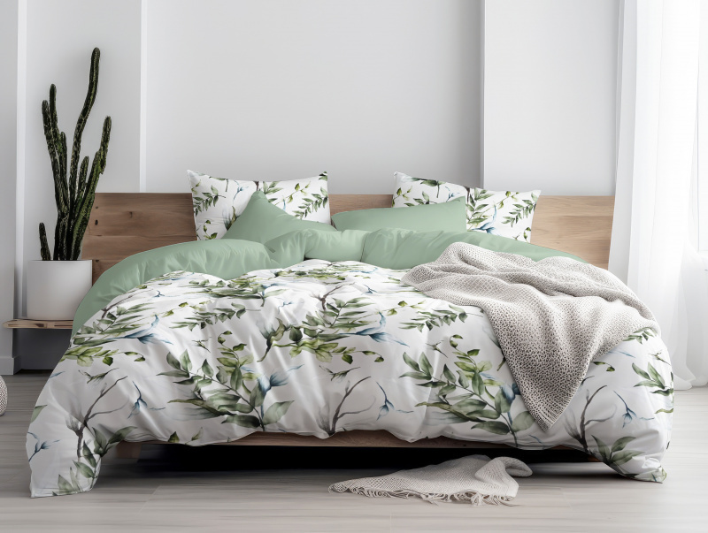 Ervi Zvýhodněná Sada Bavlněného Saténového DUO povlečení s Prostěradlem - Přírodní dotek/light mint