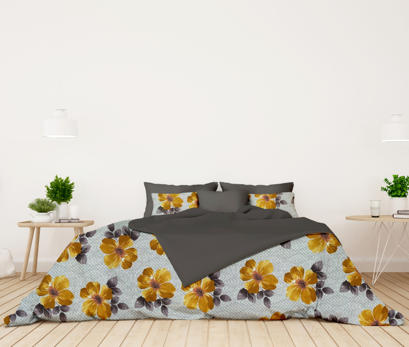 Ervi FLANELOVÉ bavlněné povlečení - oranžové květy na šedém/šedé