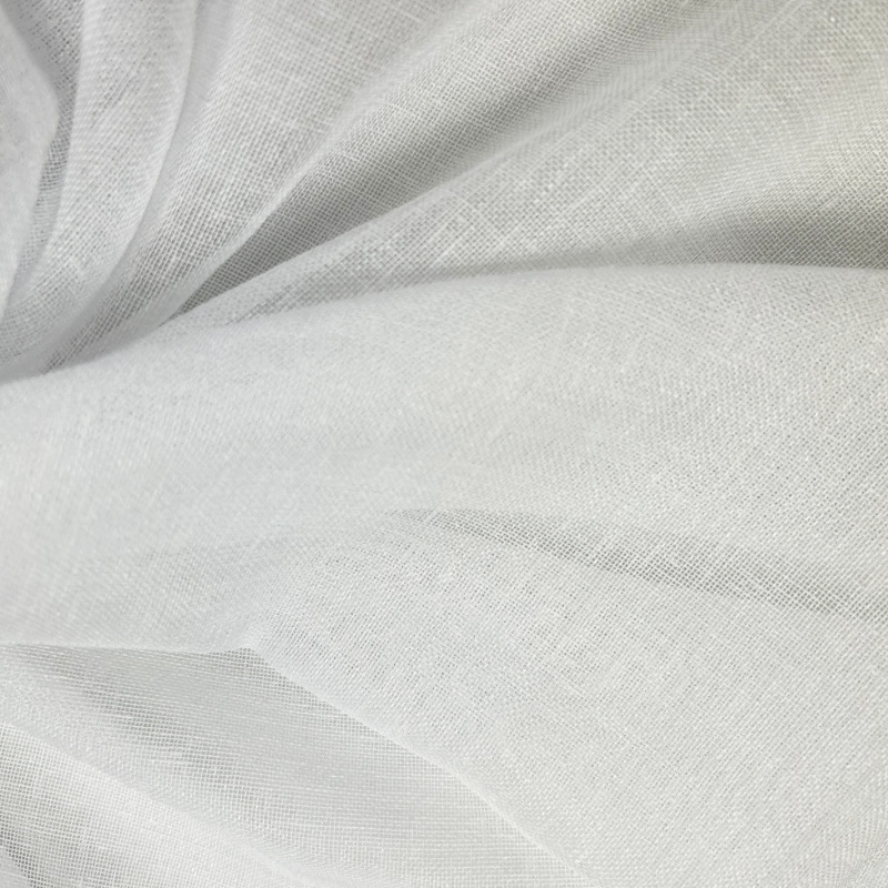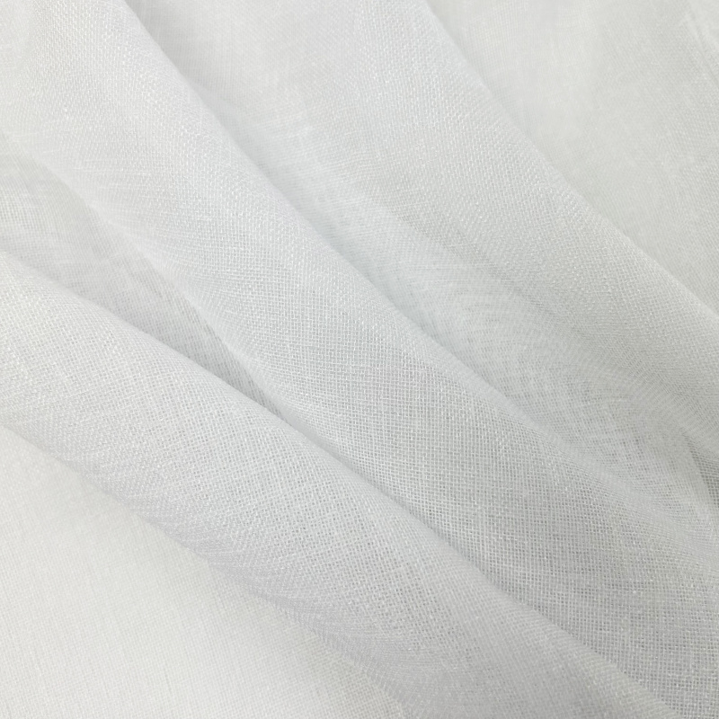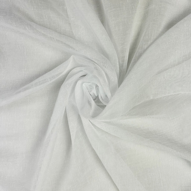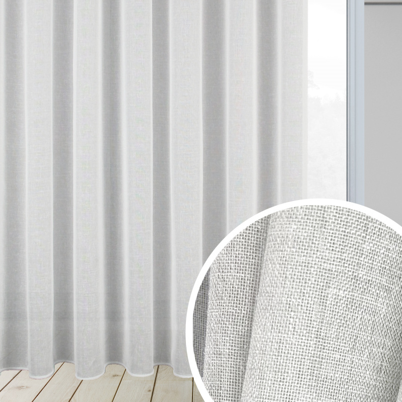 Mírně průhledná voálová látka v bílé barvě ve lněném vzhledu s našitou řasící páskou 6 cm a obšitím bočních okraů.