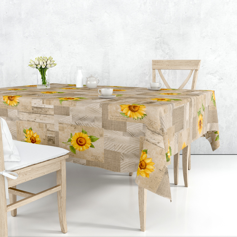Omyvatelný PVC ubrus v šířce 140cm se vzorem slunečnic.