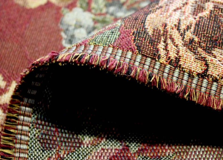 Tato dekorační/potahová gobelínová látka má bohatý květinový vzor s růžemi v odstínech zlaté a růžové na bordové (vínové) základní barvě. Květiny jsou doplněny zelenými listy a drobnými modrými kvítky, což vytváří elegantní a klasický vzhled. Tento gobelín je vhodný pro dekorativní účely nebo jako potahová látka na nábytek, dodávající interiéru luxusní a tradiční atmosféru. Je vyrobena z kvalitních materiálů, což zajišťuje dlouhou životnost a odolnost vůči opotřebení. Perfektně se hodí pro výrobu polštářů, přehozů, závěsů a čalounění různých druhů nábytku, jako jsou křesla, pohovky nebo židle. Tato látka přináší do vašeho domova šarm a luxus.