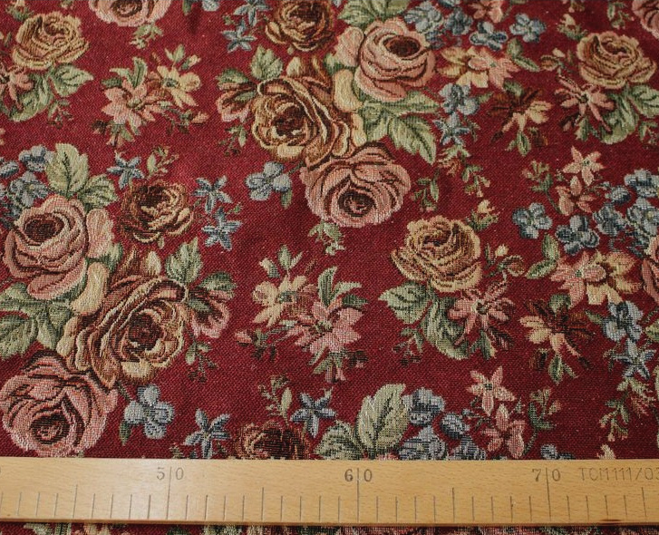 Potahová gobelínová látka v šířce 140cm se vzorem růžiček. Tkaná silnější nití v barvě bordo a slabší hnědou, zelenou, modrou, červenou, bílou. Prodáváme v metráži